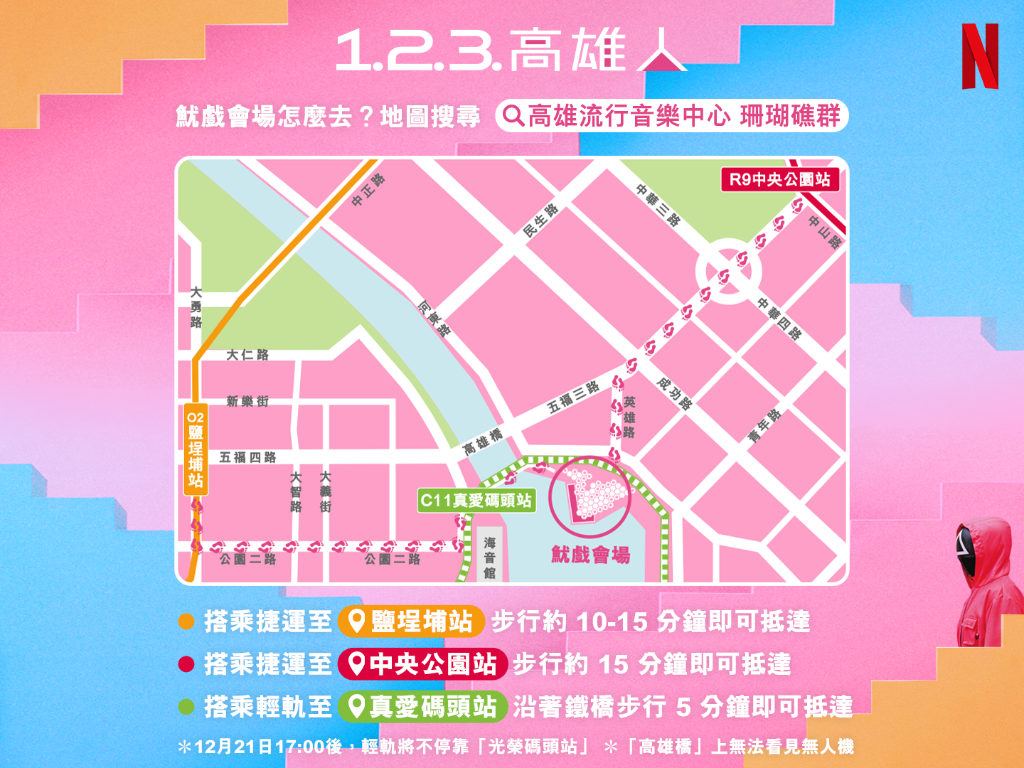 不僅如此,在12月21日活動當日,更將打造一場《魷魚遊戲》無人機大秀,長達近10分鐘的無人機大秀,將暗藏劇情線索!?運用無人機多樣變化,呈現《魷魚遊戲》經典畫面。同時間預計高雄流行音樂中心珊瑚礁群將會是一場匯聚市民與全球粉絲的萬人粉紅派對,邀請粉絲一起化身為「粉紅守衛」,為愛河灣的天空點亮無數粉紅色光點。