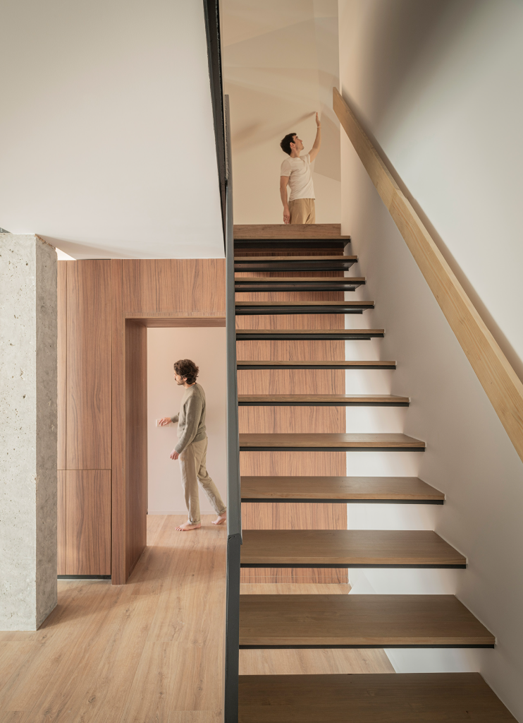這項充滿巧思的設計方案最大的特色在於將閣樓空間規劃為兩個樓層,且各樓層都圍繞著一條主要軸線展開。這兩條交錯的軸線不僅創造出饒富趣味的公共空間,更透過強化自然採光及通風效果,大幅降低住宅的能源消耗率。
