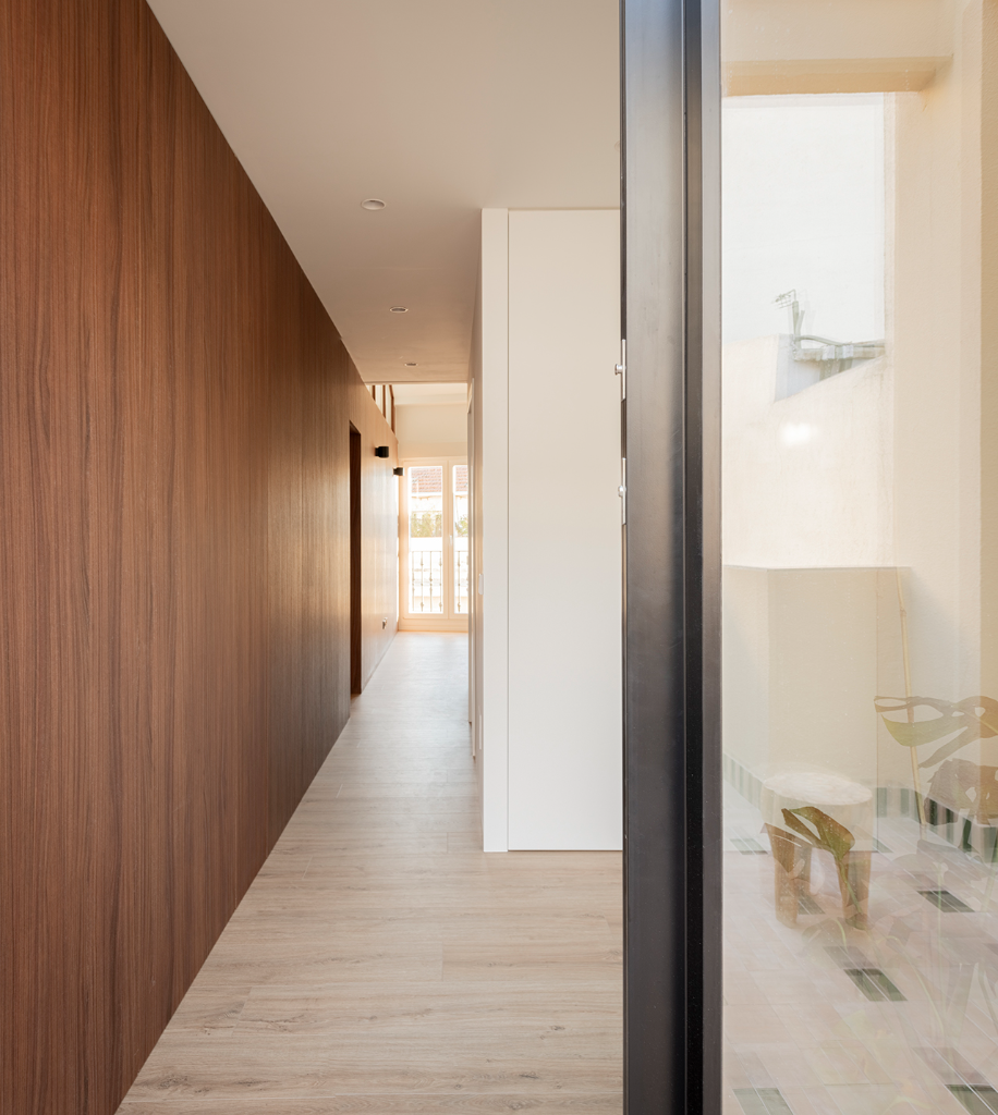 首層空間作為住宅的主要入口,以水平軸線為主軸進行配置。設計師巧妙安排一面多功能的裝置牆,將整個樓層分割成公私領域兩大區塊。這面牆不只是簡單的隔間,更融合多項生活機能,充分展現設計師的智慧。在私人區域方面,設計師則採用線性序列的配置,將臥室、浴室、更衣室與露台等空間串聯在一起,藉此打造出一個寧靜的夜間生活場域。每個空間都經過精心設計,確保擁有充足的對外開口,以最大程度引進自然採光,同時創造出良好通風效果,這樣的設計不僅提升了居住舒適度,更達到節能環保的目標。