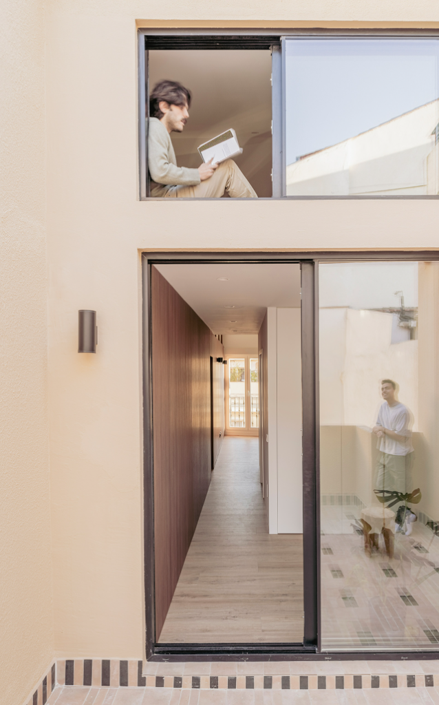公共區域則規劃為一個寬敞的開放式空間,完美整合客廳、餐廳與廚房的功能。這個區域透過兩個陽台與街景相連,不僅導入充沛的光線,更讓室內外空間產生流暢的對話。同時,這個區域也設計了通往二樓的樓梯,進一步強化了垂直空間的連結性。