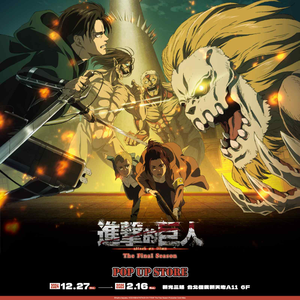 搭著劇場版上映的熱潮,從12月27日開始到明年的2月16日,《進擊的巨人:Final Season》快閃店也即將在台北新光三越A11開跑,現場將會有「進擊的巨人」拍照打卡點、大扭蛋機以及超越時空的異空間「道路」的必拍場景,還有近60款全新周邊強勢登場,更多進一步消息也將陸續釋出,再請關注木棉花社群,就讓滿滿「進擊的巨人」的活動陪粉絲跨過2024,迎接2025。