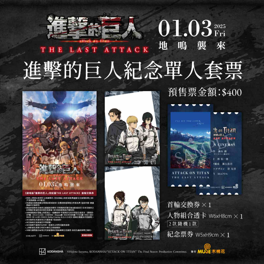 《劇場版「進擊的巨人」完結篇THE LAST ATTACK》即將於 1 月 3 日全台上映,推出了電影紀念單人套票,內容包含「首輪電影票乙張」與「人物組合透卡乙張」(兩款隨機一款)以及「紀念票券乙張」,其中除了紀念票券外首輪交換券票面也可以保存票根,讓喜愛《進擊的巨人》的忠實粉絲留念收藏!12月13日起在金石堂、博客來、買動漫等通路都可以買得到。
