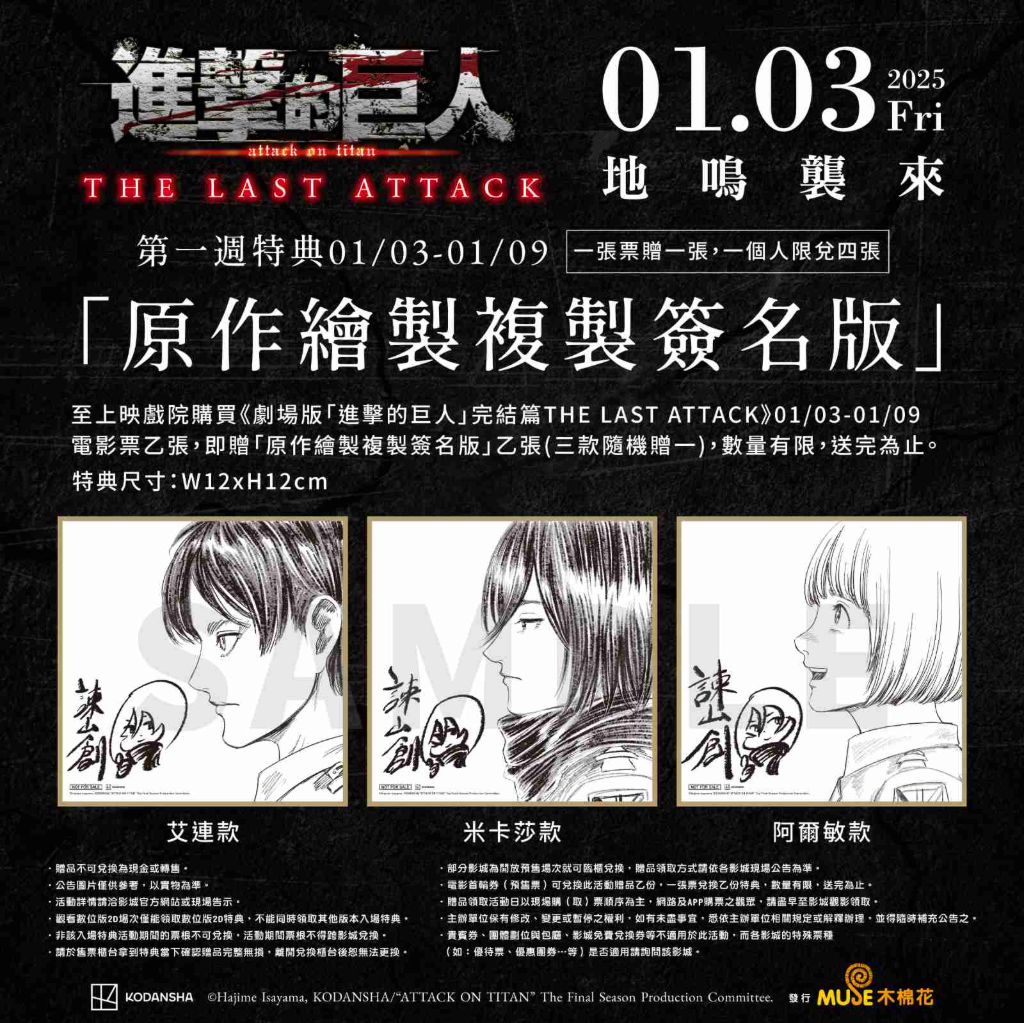 電影上映首週將推出特典「原作繪製複製簽名板」,為原作諫山創老師特別為電影繪製的簽名板,有三位主角艾連、米卡莎、阿爾敏不同神情的側臉,三款將隨機贈送一款 ,相當具有收藏價值,數量有限,喜歡的粉絲趕緊進戲院「大銀幕」觀賞《進擊的巨人》倍感震撼又感動的完結畫面吧。