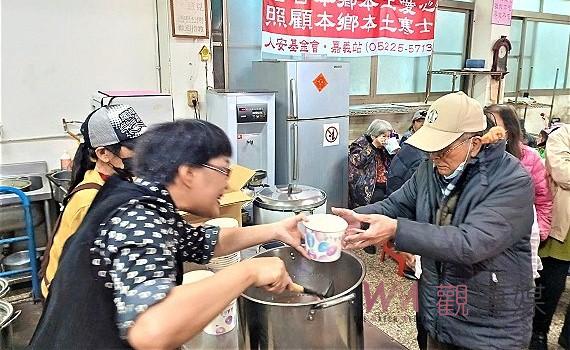 (觀傳媒嘉義新聞)【記者郭政隆/嘉義市報導】12/21日是今年的冬至,傳統習俗是闔家團圓吃湯圓的日子,但在此時,社會上卻仍有許多寒士朋友,必須獨自承受著孤寒,人安基金會嘉義平安站為讓寒士也能感受團圓暖意,12/21日舉辦「冬至暖心祈福」活動,嘉義市愛鄉慈善會陳盈坤理事長、番社里鄭秀玉里長、西榮里林芳志里長以及嘉邑城隍廟共襄善舉,準備象徵團圓的湯圓與暖呼呼的麻油雞湯,與寒士分享溫暖;現場更邀請布丁老師-志工劉品筠小姐,帶領寒士團體康樂課程與正念靜心練習,寒士們在現場露出難得的笑容,氣氛相當熱鬧溫馨。