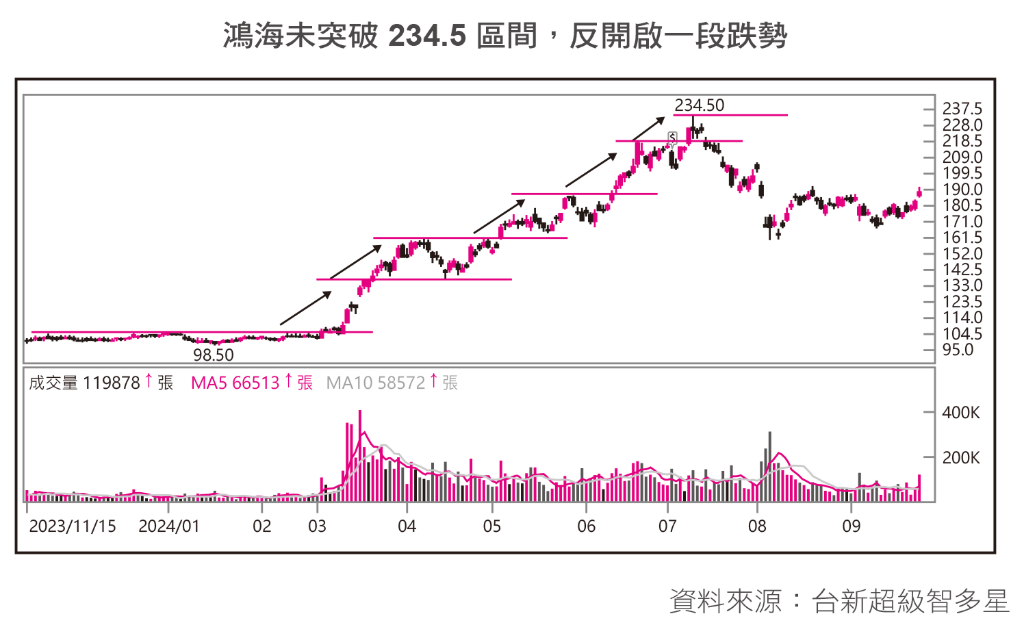 代工龍頭鴻海的走勢也是如此,當然每檔個股的股性略有不同,但大多的個股波段仍是走階梯式,下圖可看出鴻海2024年的一整個波段漲勢,亦是階梯式的,直到高點234.5元後就未再突破,股價反而跌破區間下緣(前波區間的上緣線)。當跌破區間下緣時,代表股票波段趨勢改變,大多個股會回檔下跌,並進入新的區間整理。當區間整理完後,則看股價會突破區間上緣或是區間下緣,代表新一波的走勢。