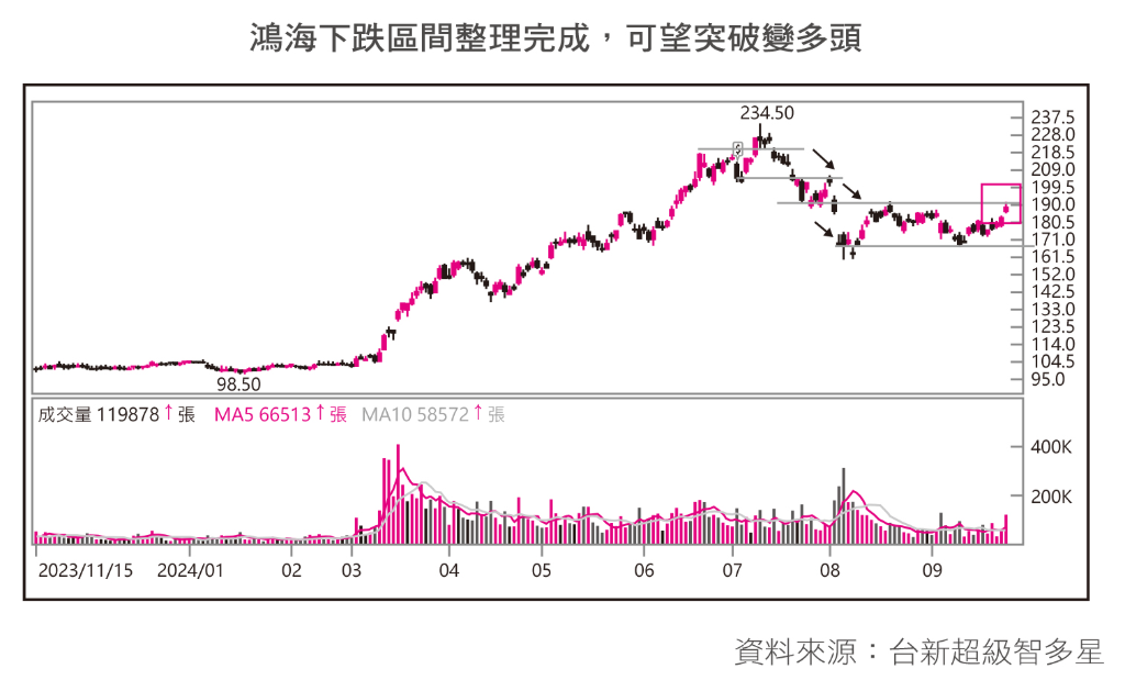 從下圖可看出,鴻海即將突破區間整理,可能開始新的上漲走勢(如下圖紅框處),如果突破,則會上漲一個小波段,然後進入新的區間整理,並等待下一次的突破或跌破。