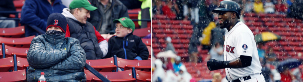 打過15年大聯盟、綽號「快腿米克」(Mick the Quick)的李維斯(Mickey Rivers)有次在華氏48度(約攝氏7度)的低溫出賽,他說:「天氣有夠冷,冷到我看見狗在追貓,兩者都是用走的。」今日波士頓不但溫度低至華氏44度,還刮風下雨,據轉播單位表示「體感溫度」只有華氏38度(約攝氏3度)。