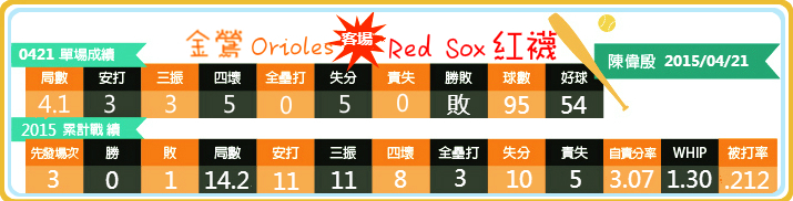 開季3戰,勝投尚未入帳,這與前年的情況有些類似,還好此役所掉5分均非責失,自責分率目前降至3.07。5天後殷仔又將遇上紅襪,這回在主場迎戰,希望他趕緊在「休四」期間檢討得失,下一仗不但要討回顏面,更要讓勝投開張。