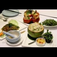 這道椰子蝦仁炒飯可是晶湯匙泰式主題餐廳的招牌菜,為了保持食材的新鮮,只有在接到單子後,才會現場剖開椰子,將現炒好的飯放入椰子殼中,讓炒飯吸取椰子的香氣,炒飯特別選用泰國米,粒粒分明不軟爛的口感特性,再加入蛋、青豆、鮮蝦,還有還有,更特別的是還加入了新鮮的椰肉一起下去拌炒而成,讓整個炒飯裡充滿了淡淡的椰子香氣,更加的爽口。喜歡較重鹹的朋友,可以淋上一點魚露醬,馬上有不同的滋味體驗。