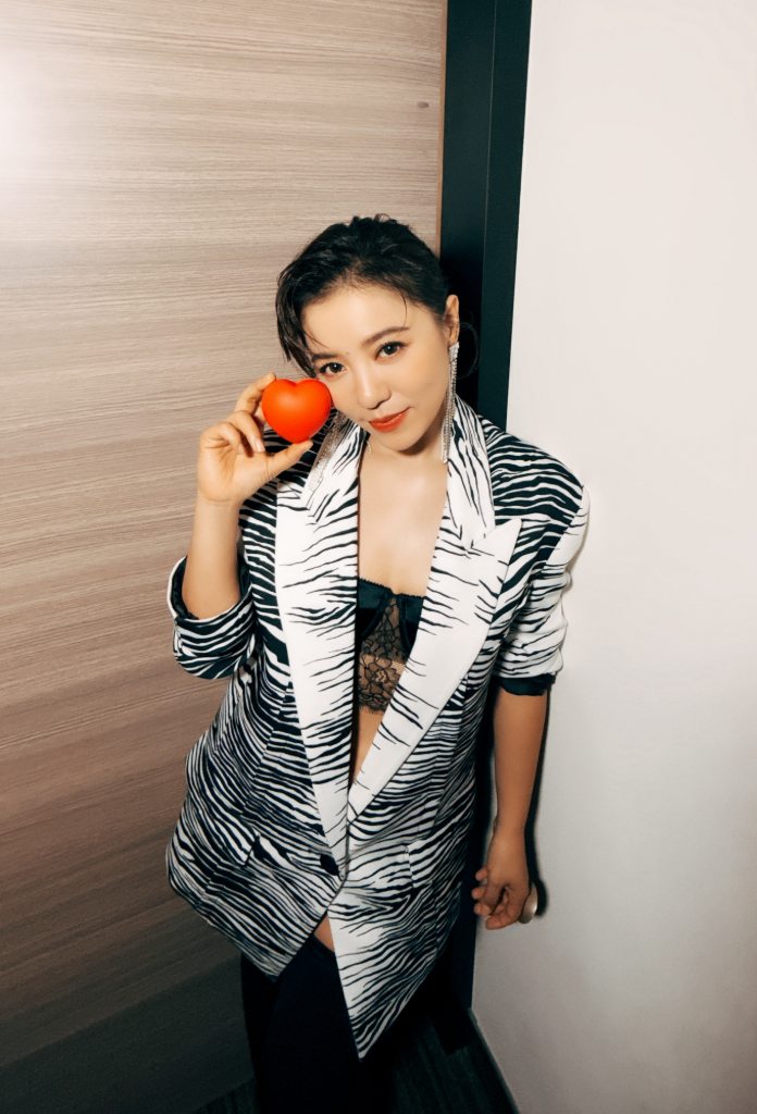 ▲ 丁噹身穿性感斑馬紋西裝,桃園跨年放送愛心捏捏球願把不好的事都捏爆。(圖:相信音樂)