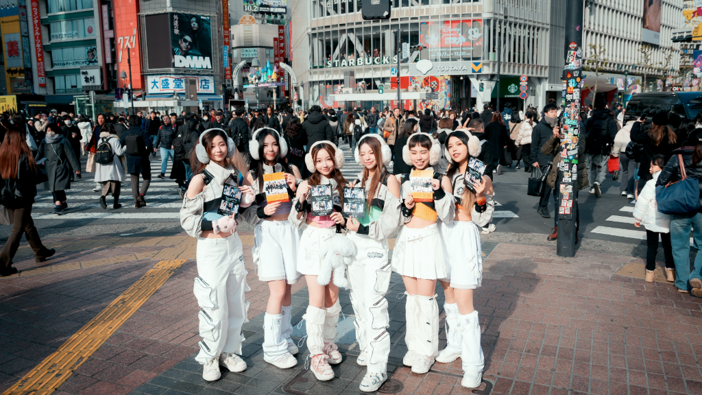 ▲ babyMINT在澀谷十字路口(左起:熙妍、Vikky、栩栩、粼粼、品妡、丞妘)。(圖:華研)
