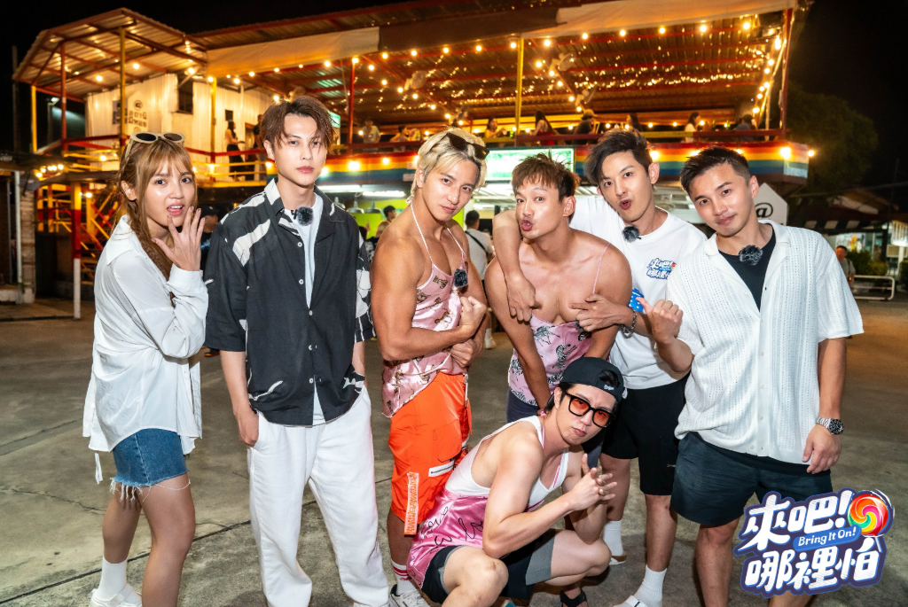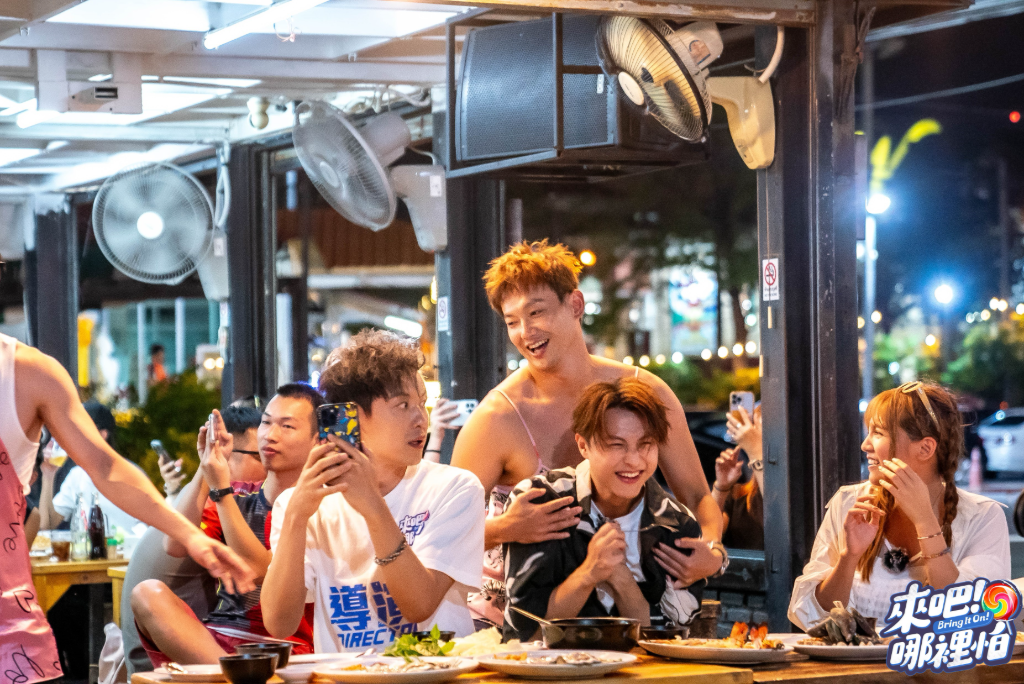 ▲ 朵拉(左起)、王子、小煜、小杰、威廉、敖犬、阿緯泰國體驗猛男桌邊服務。