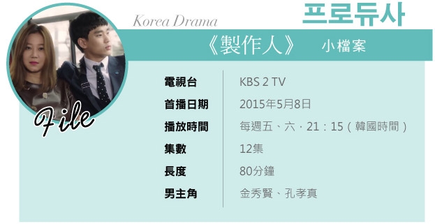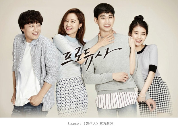除了閃亮亮的演員名單之外,《製作人》戲裡的演員們演繹的正是韓國兩大熱門綜藝節目的節目製作人-孔孝真飾演《音樂銀行》PD、車太賢飾演《兩天一夜》PD,加上公司新人金秀賢和人氣歌手IU,四個人之間到底會有甚麼樣的發展,讓劇迷們光是猜想就高興的不得了!