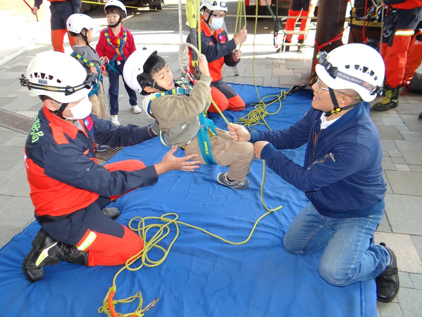 ▲小朋友高興參加繩索救援示範。
