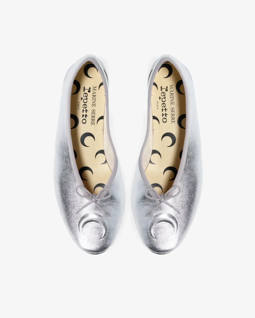 此次合作系列推出了兩款備受矚目的Repetto經典鞋款:前衛的Lilouh(黑色、銀色)以及經典的Camille,採用Marine Serre標誌性的「全月亮」印花。永續時尚是此次合作的核心價值之一。Marine Serre創新性地運用再生材料,完美契合了Repetto對法國製造工藝的堅持,以及由Rose Repetto開發的獨特「縫合」製作工藝,賦予鞋子無與倫比的柔韌性。