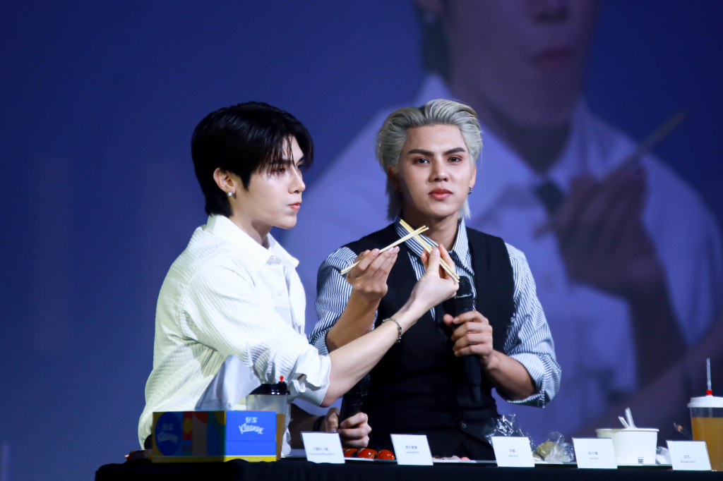 為了讓兩人更了解台灣美食文化,現場特別準備了多種道地小吃,包括草仔粿、大腸包小腸、楊桃汁等。當Fort嘗試草仔粿時,他露出了微妙的表情,隨後喝下一口楊桃汁又忍不住失聲尖叫,逗得全場粉絲大笑不已。兩人對大腸包小腸讚不絕口,直呼這是泰國沒有的特色美食。他們甚至互餵起大腸包小腸,引發全場粉絲的連連尖叫與拍照聲。兩人的真實反應與幽默表現,進一步拉近了與粉絲之間的距離。
