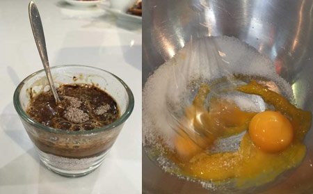 2、 準備一個乾淨的鍋子,打入3顆蛋黃,再加上50g細砂糖,用打蛋器攪拌,直到細砂糖融化為止。如果用電動攪拌棒會更快完成這步驟。