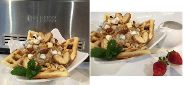 鬆餅的製作方法步驟是一樣的。我們將做好的鬆餅成品當底部裝飾,這時我們把杏仁腰果和剛起鍋的咖啡冰淇淋一起攪拌,就可以開始妝點擺盤囉。這樣的混搭,是多種口感與美味的絕妙組合,你一定要試試看。