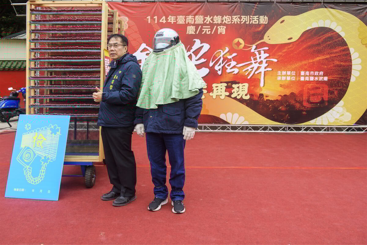 ▲黃偉哲市長指示,體驗犁蜂炮的過程中務必穿戴完整的防護裝備,並保持5至10公尺的安全距離,才能玩得開心又安全。。(記者劉秋菊攝影)