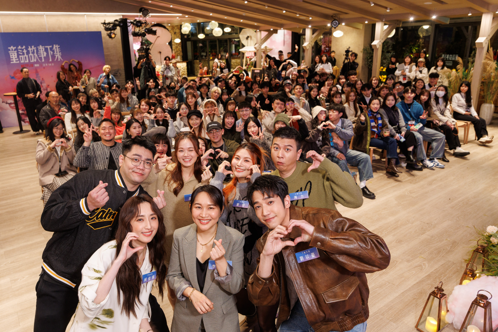 ▲ 柯佳嬿、編導李念修、劉以豪(左下起)、巨人、彥婷、董仔、海力(左上起) 與現場觀眾開心合影。(圖:Netflix)