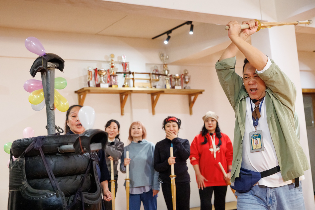 三位星級領隊帶著四位姐姐造訪劍道館,讓她們大力揮舞竹劍「