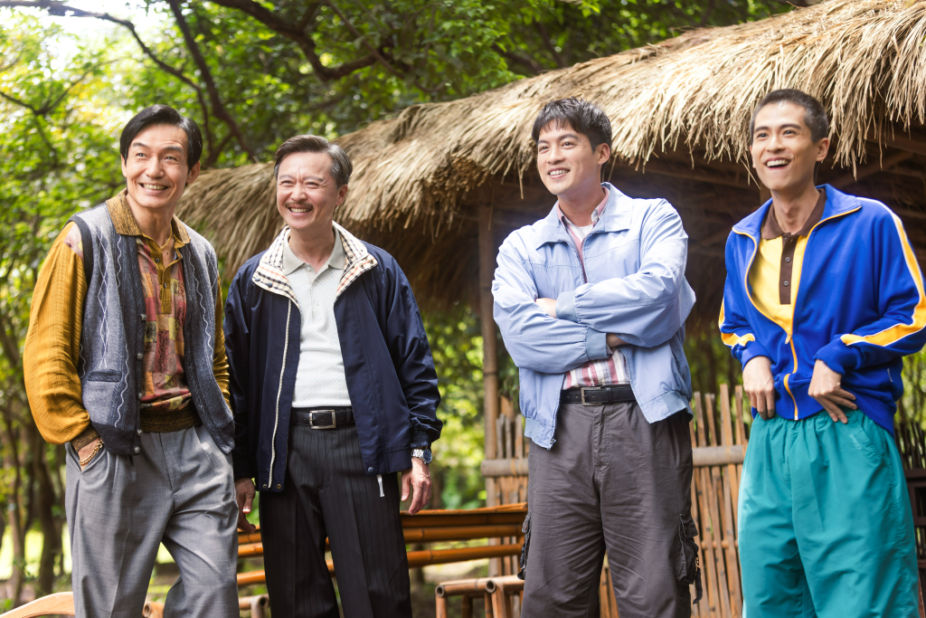 ▲ 電影即將在鎮上開拍,吸引許多鎮民(左起霍正奇、何豪傑、許孟哲、石知田)好奇圍觀。(圖: 公視台語台、華視提供)