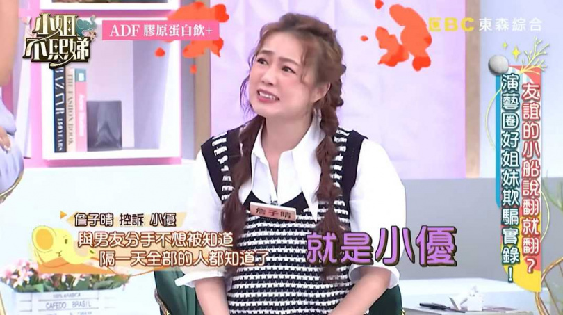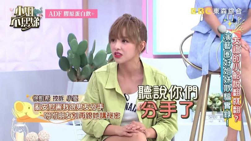 一旁的丫頭也加碼爆料,她曾和某任男友分手,不想讓別人知道,只告訴小優和另一個人,並提醒不要告訴別人,但隔天10多個人吃飯的場合,大家馬上圍上去關心:「妳不是又分手了嗎?」讓她十分傻眼,直言:「就是小優!」