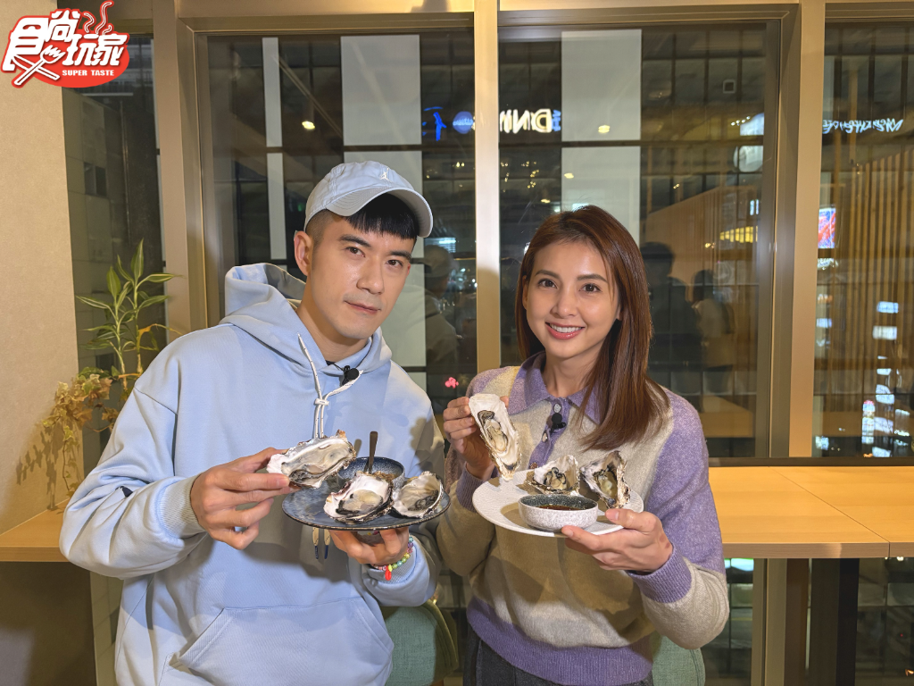 ▲ 紀言愷(左)、韋汝品嘗北海道鮮美牡蠣。(圖:TVBS)