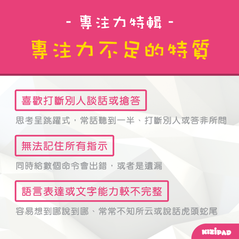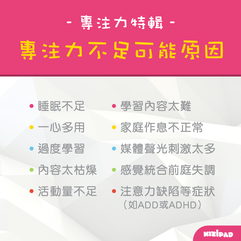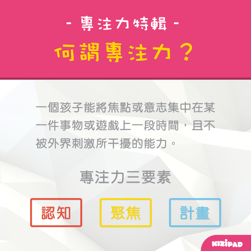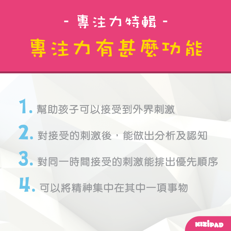 在這,Kizipad 將為您分析、解釋孩子專注力的秘密。到底何謂專注力? 專注力的功能有哪些? 專注力的種類有哪些? 專注力不足的共通特質有哪些? 專注力不足可能的原因有哪些? 以及我們要怎麼幫助孩子提升專注力?我們在這為您再說明之。