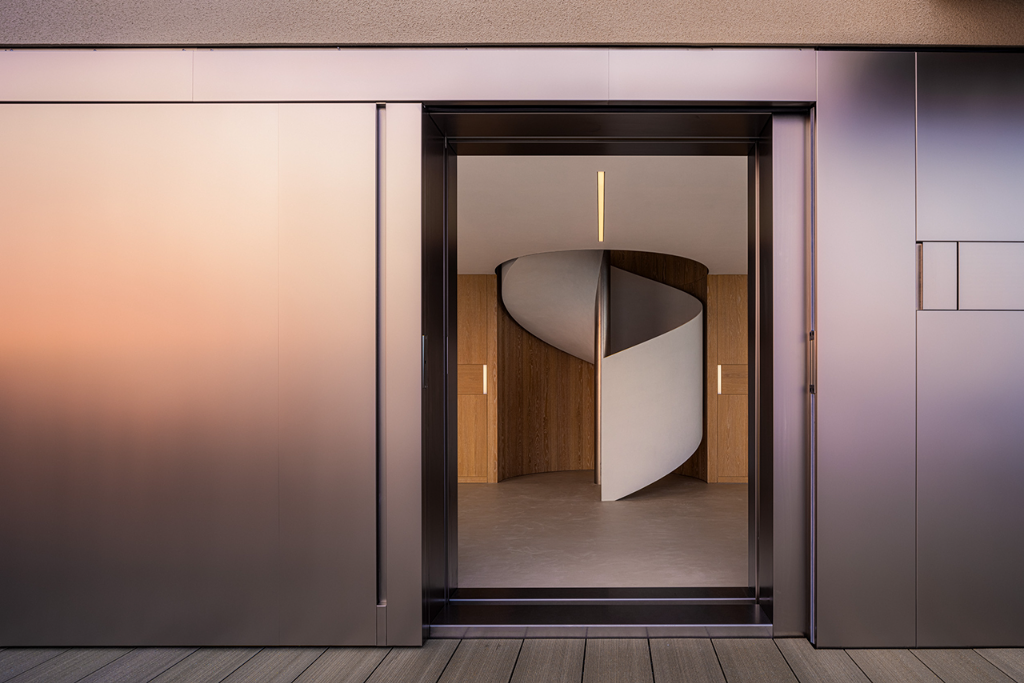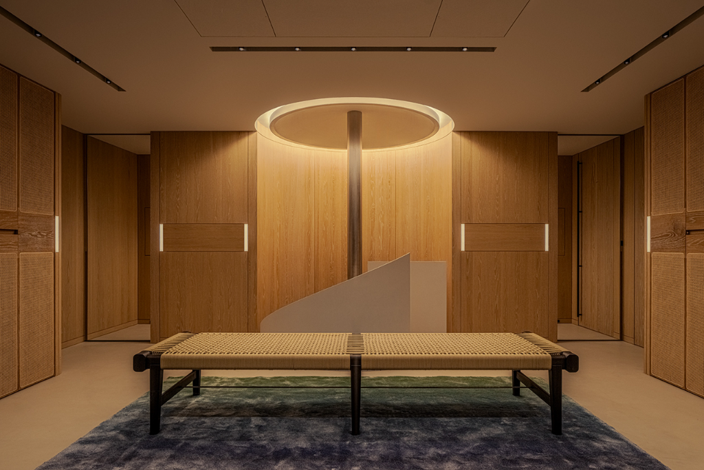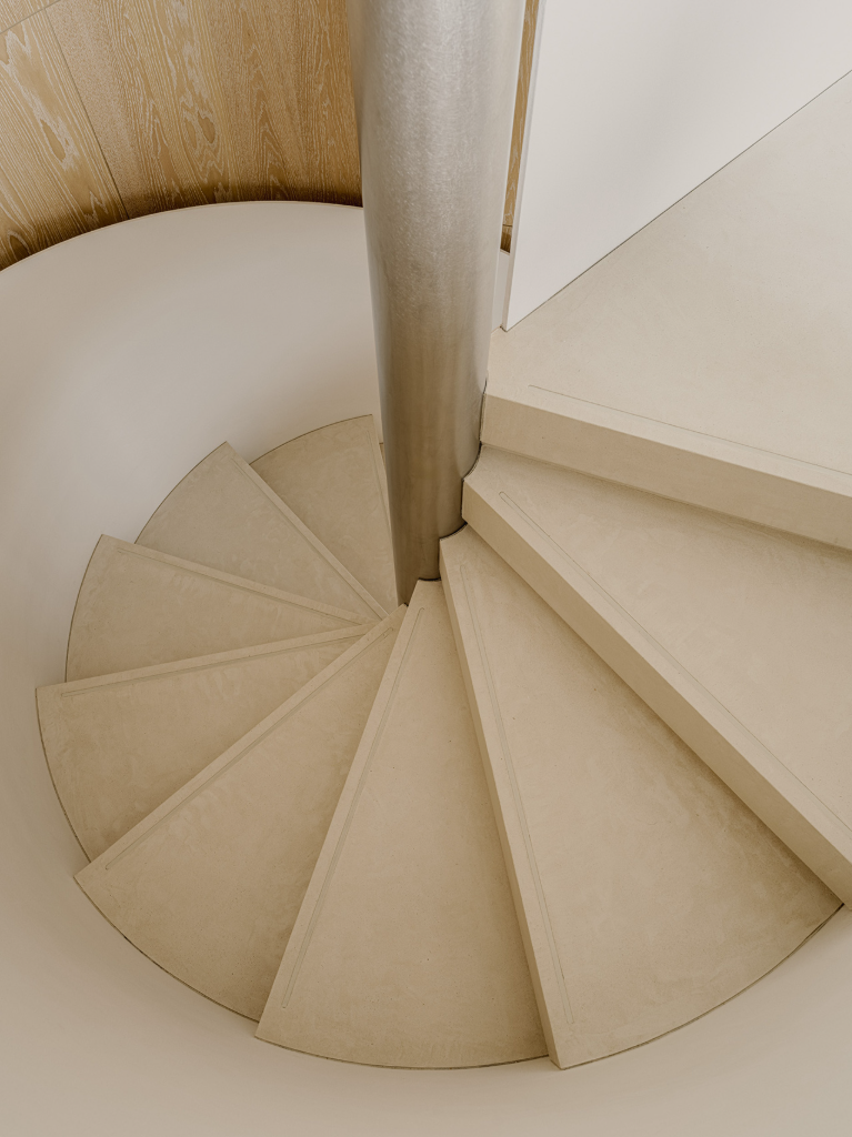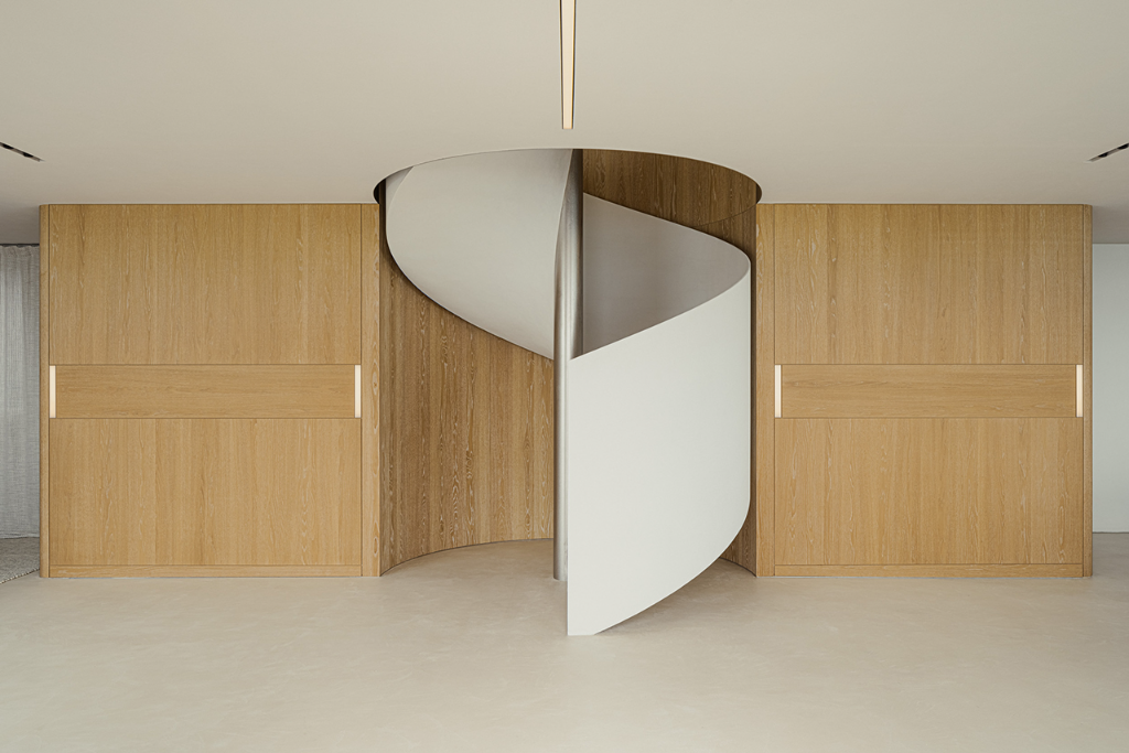 走入建築內,中央的螺旋階梯成為空間的視覺焦點。這道樓梯不僅是垂直動線的連結,更像是一座雕塑,引導人們穿梭各個場域。牆上的燈光猶如指引方向的燈籠,使行進間的步伐增添儀式感。