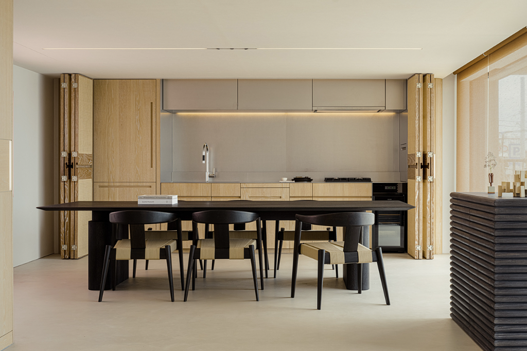 至於木材在這座住宅中則扮演重要角色,從地板到牆面,每一片木料皆經過刷洗處理,呈現溫潤細膩的肌理,使空間散發自然的生命感。所有木作皆由工匠手工完成,讓時間的溫度滲透進空間的每個角落。