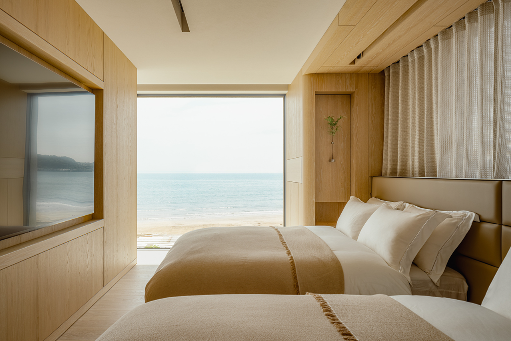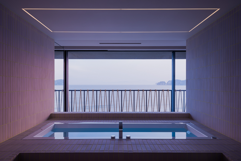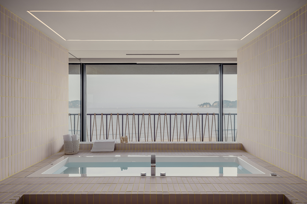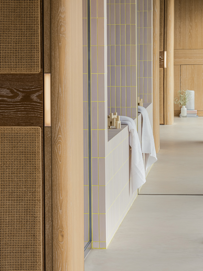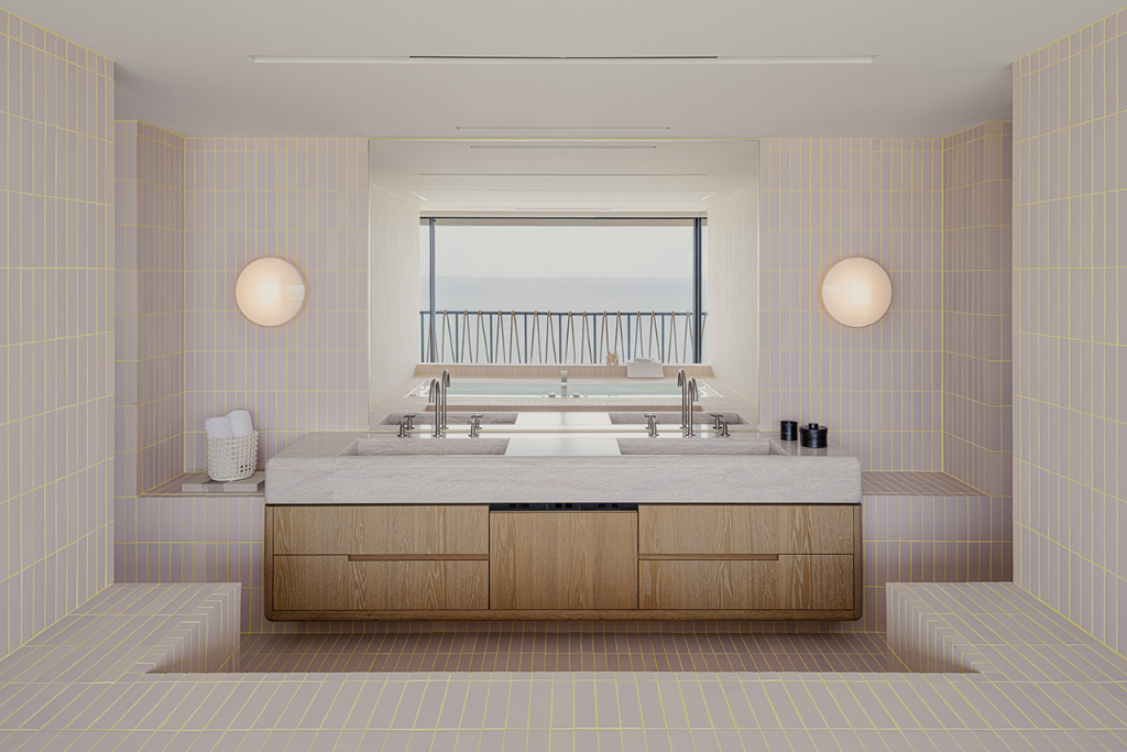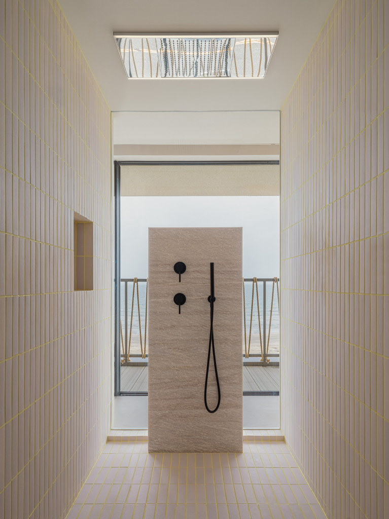 三樓設計圍繞著更衣空間展開,開放式衣櫥置於中央處,象徵穿衣打扮在日常生活中的重要性。這個更衣區不僅提供機能性的收納,更塑造出一種流暢的迷人節奏,讓每一天的開始與結束都帶著精心安排的儀式感。浴室則與海景緊密結合,從淋浴間、盥洗台到浴缸,水的流動貫穿整體動線,讓人在居家日常中與自然相連。粉色瓷磚搭配黃色填縫線,令整體環境散發出時尚與趣味的氛圍,彷彿延續了服裝製作時布料與縫線的關係。