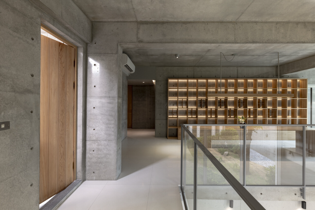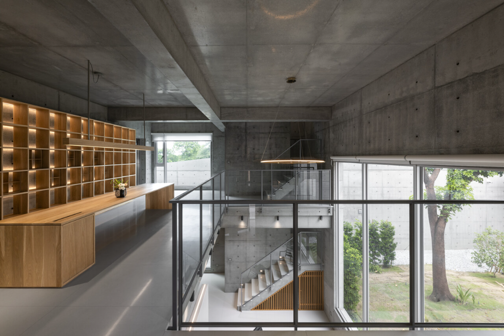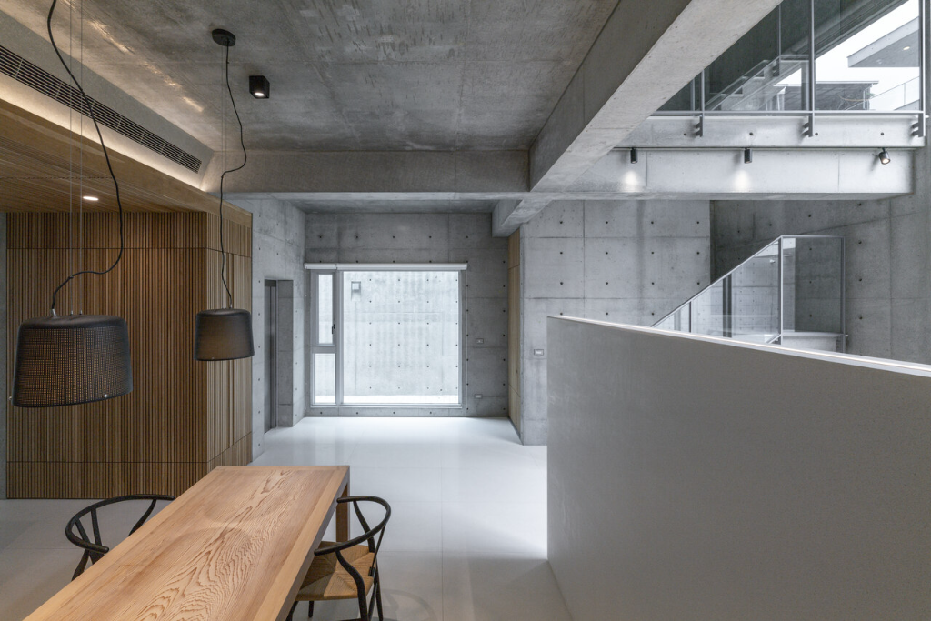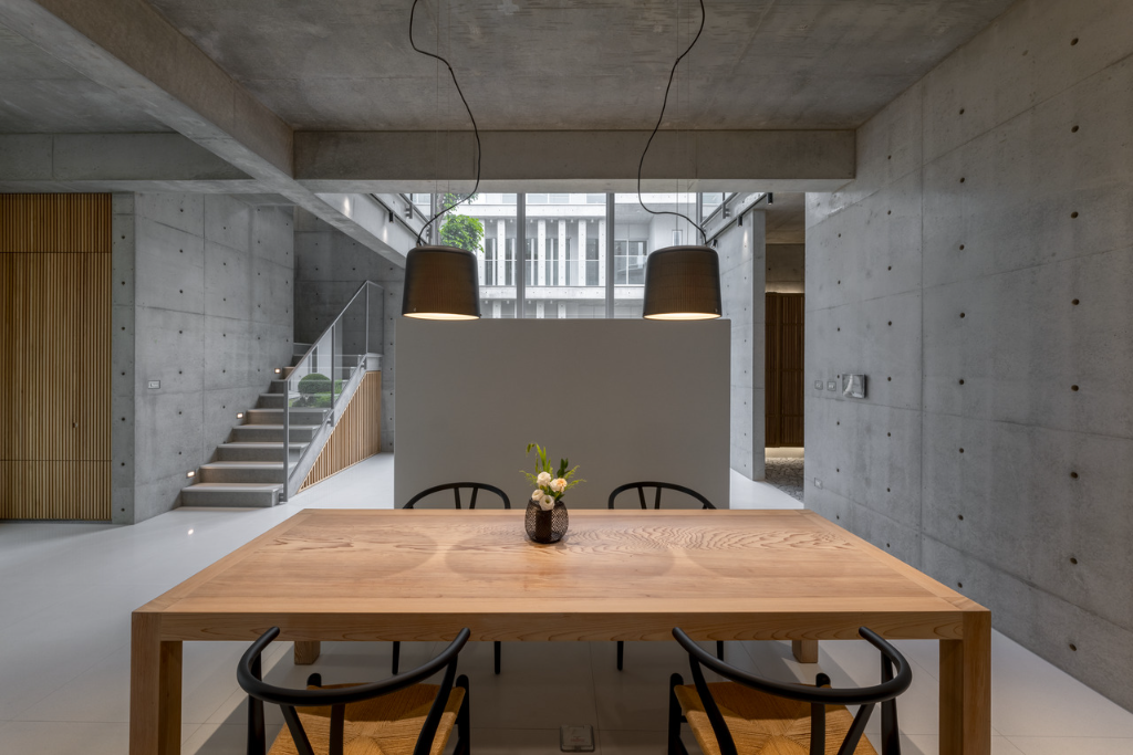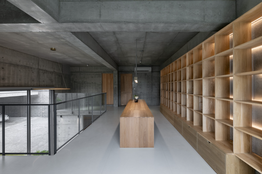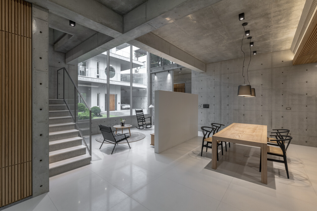 走入客廳,清水模的工藝由外延伸入內,搭配上原木的家具及隔柵,使空間呈現出質樸而靜謐的氛圍。區域的分別就藉由盒中盒的概念劃分空間,就像大空間內的小空間一樣,客廳、餐廳、廚房分別而立卻又互相串接,二樓則是書房及臥室,偌大的開放式書房猶如圖書館意境,視線極佳之外也可以俯瞰樓下。看向窗外不難發現建築外圍有道圍牆,九米高的圍牆由高而低形成一座梯形,梯形內側的空間擺放綠植栽,不論你走在空間的哪一處,都可以看到綠意盎然的景致。