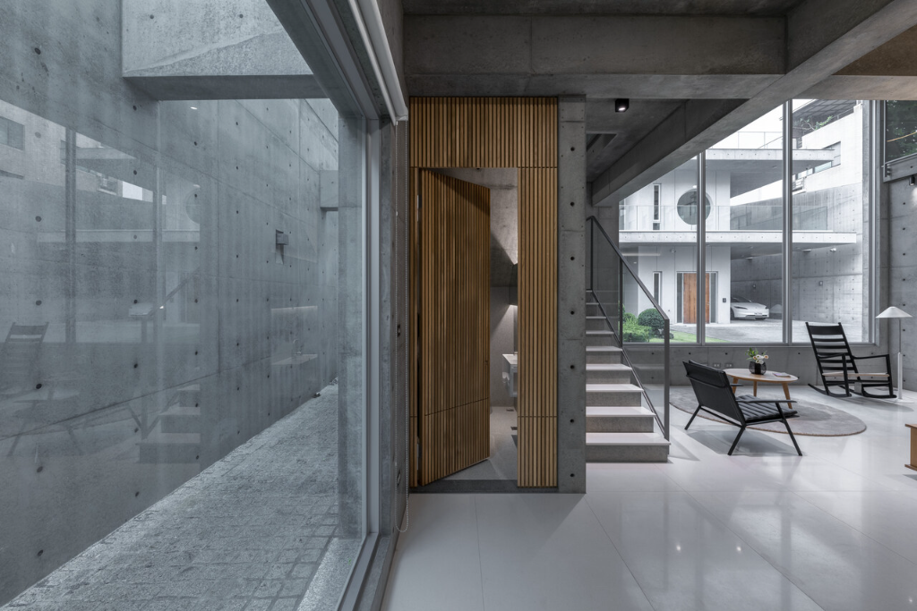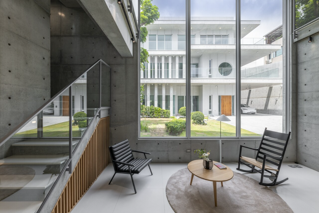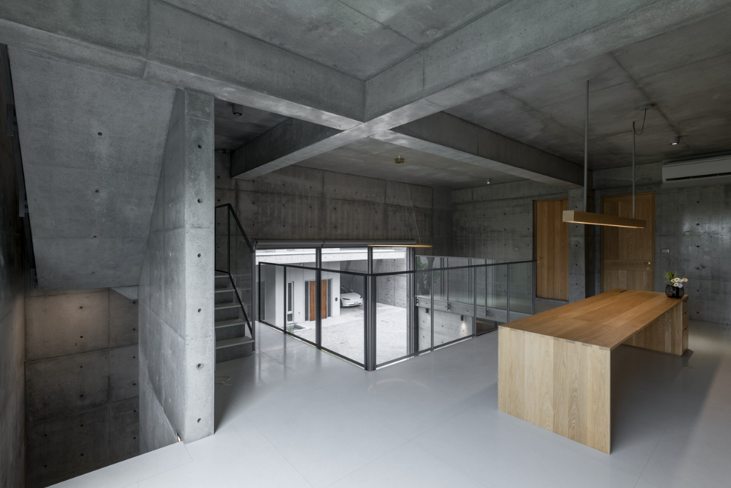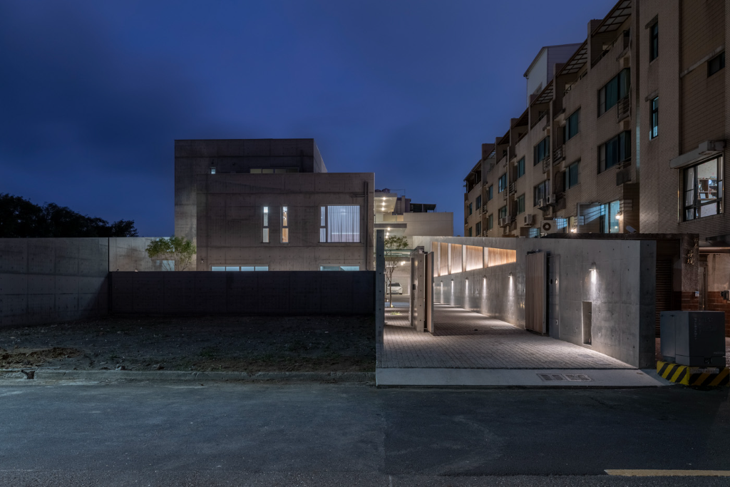 家,是每一個人的安身立命之所,不論是上班亦或外出遊玩,下了班、遊玩結束後身心疲憊之餘,最終的歸處就是那溫馨的「家」。它,是一個可以放鬆自我、使人安心之地,更是一個避風港。而家人,更承載著血緣的關係,有著密不可分的親情,是不可或缺的扶持力量。此案坐落於台南市都會區,在建築基地上一連三棟建築,從挖地基到建築完成花了四到五年的時光。白色建築及灰色建築比鄰而居,父母帶著孫子在過道散步享受天倫之樂,便可由白色建築走到灰色建築,而由清水模構成的灰色建築是設計師一貫的設計手法,二個大小不同的方形量體藉由樓梯串連,形成一道入口,將動線作分流之外,也不互相打擾,而另二個入口分別是在客廳及車庫。
