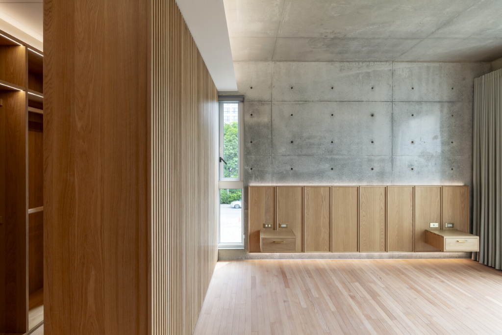 就如同設計師所言,他是在設計空地而不是建築量體、設計生活而非空間。極富令人省思的一段話,就如同自然一樣,既然都會區鮮少有樹木,那就創造自己的綠景,二樓、三樓、四樓亦是如此,就連沿著樓梯下樓,往下看便能看到一棵綠樹佇立在樓梯旁,隨著腳步移動綠意也隨之而行。傍晚時分,夜晚為燈光拉開了序幕,透過簡練的幾何開窗,露出微黃的光線,一家人的歡樂笑聲就在這生活中產生。