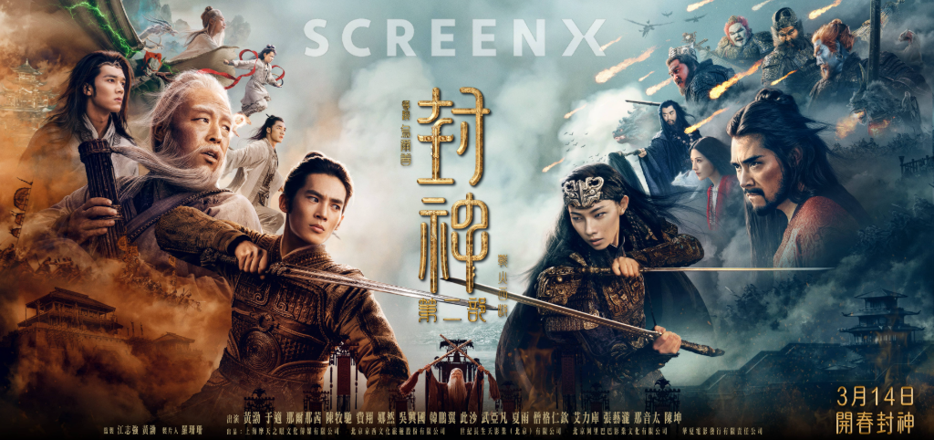 此次《封神第二部:戰火西岐》不僅帶來IMAX極致沉浸感,更將成為台灣首部SCREENX華語電影。SCREENX透過三面環繞式銀幕技術,讓影像延展至影廳側牆,觀眾將沉浸於270度的戰場視角,感受戰火紛飛的震撼。西岐城池內外的壯闊攻防戰、魔幻元素交織的神話大戰,也將在SCREENX影廳的沉浸式畫面中進一步升級。