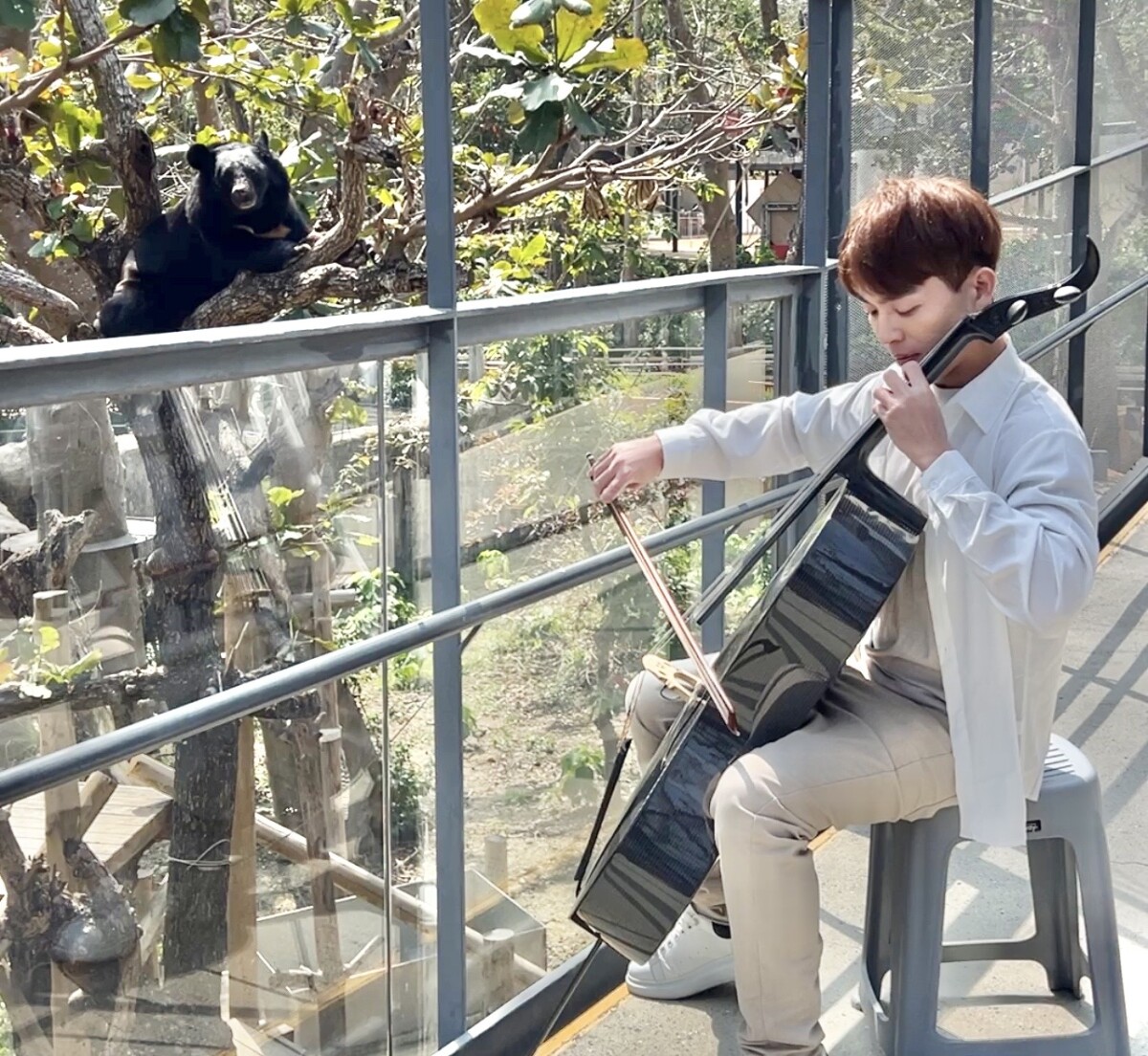 ▲黑熊「波比」爬上樹梢聆聽「綠龍與他的大提琴」為牠演奏的曲目。