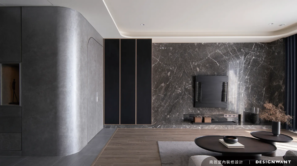 首先,大面積運用多種深淺灰、質感豐富的特殊塗料和石材,打造出空間的沉穩和諧感,這種選材的聰明之處在於,不僅使整體氛圍更加穩定,能夠攬進暖陽與無邊視野,同時賦予空間豐富層次感和肌理,木皮以深刻的文化元素點綴,散發柔和暖意,尤其在玄關入口區域,鞋櫃門片的不鏽鋼材質實用,更為進入屋內的人帶來身影上的互動,營造出溫馨而獨特的家居氛圍。