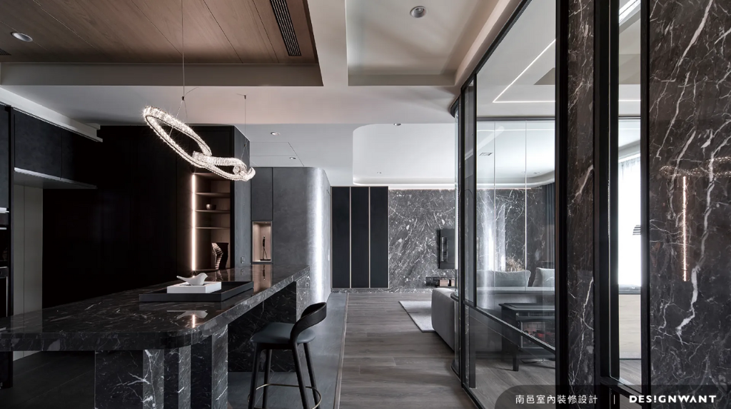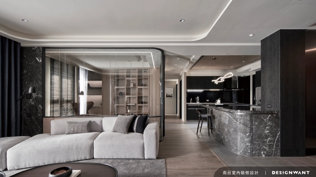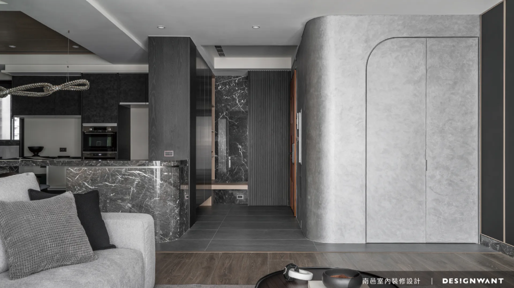 屋主夫妻對空間質感有所差異,先生偏愛穩重大氣,熱愛石材與深色調,而太太則追求奢華感與明亮氛圍,為滿足兩者喜好,設計師以深色大理石及吧檯木皮滿足先生的品味,同時運用淺灰及灰調木皮改寫空間氛圍,實現太太對明亮感的渴望,獨具奢華感的主燈成為空間焦點,為整體設計注入一抹奢華色彩,且考慮到兩位活潑的孩子,弧形的設計成功修飾整體空間,既保有精緻感,也為家庭增添活潑元素。