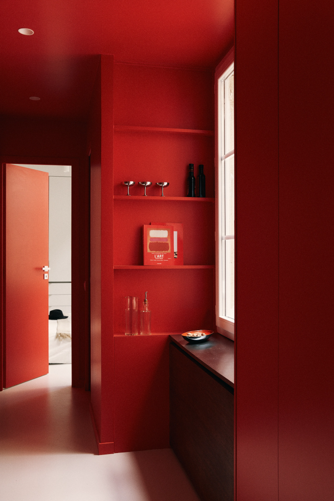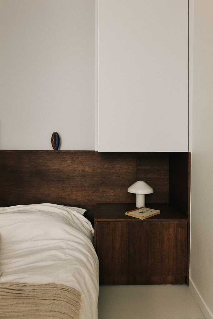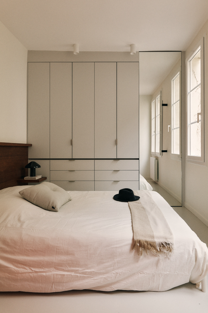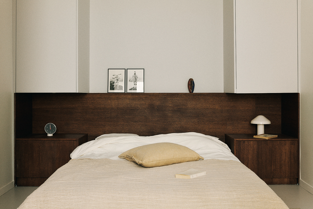 主臥室則回歸寧靜本質,極簡米白色衣櫃搭配深色木質床頭板,營造出溫潤的睡眠氛圍。大面積窗戶迎來巴黎晨光,透過鏡面反射,使房間顯得更為通透明亮。次臥則更為精緻,結合紅色門片與木質床架,使得私領域帶有一絲藝術氣息,透過不同材質與色彩的層次,形塑極具個性的休憩氛圍。
