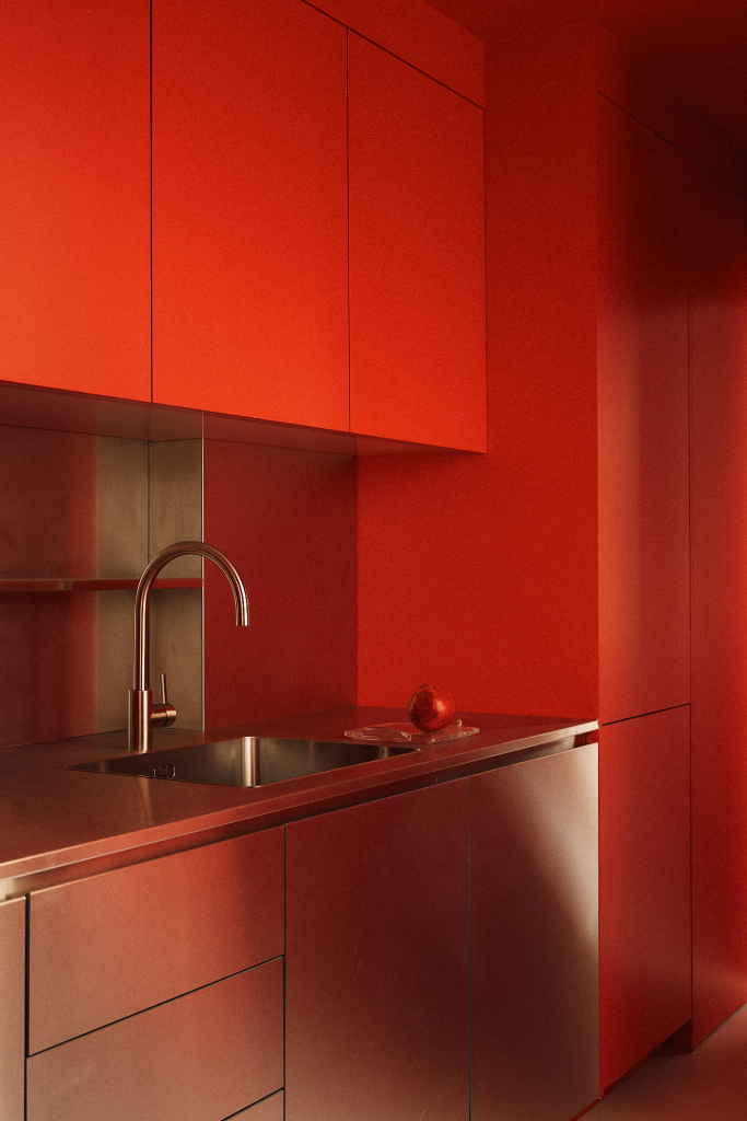 當視線移動至廚房,一股強烈的視覺衝擊迎面而來 —— 整個空間被鮮明的血紅色包覆,形成戲劇性的焦點。這種帶有橙色調的紅色,與不鏽鋼檯面形成極端對比,令廚房既熱烈又充滿個性。這樣的配色靈感源自義大利設計風格,而紅色的跳色表現方式則讓廚房顯得極具現代感,也與其他場域的沉穩色調形成張力,使得整體設計更富層次。
