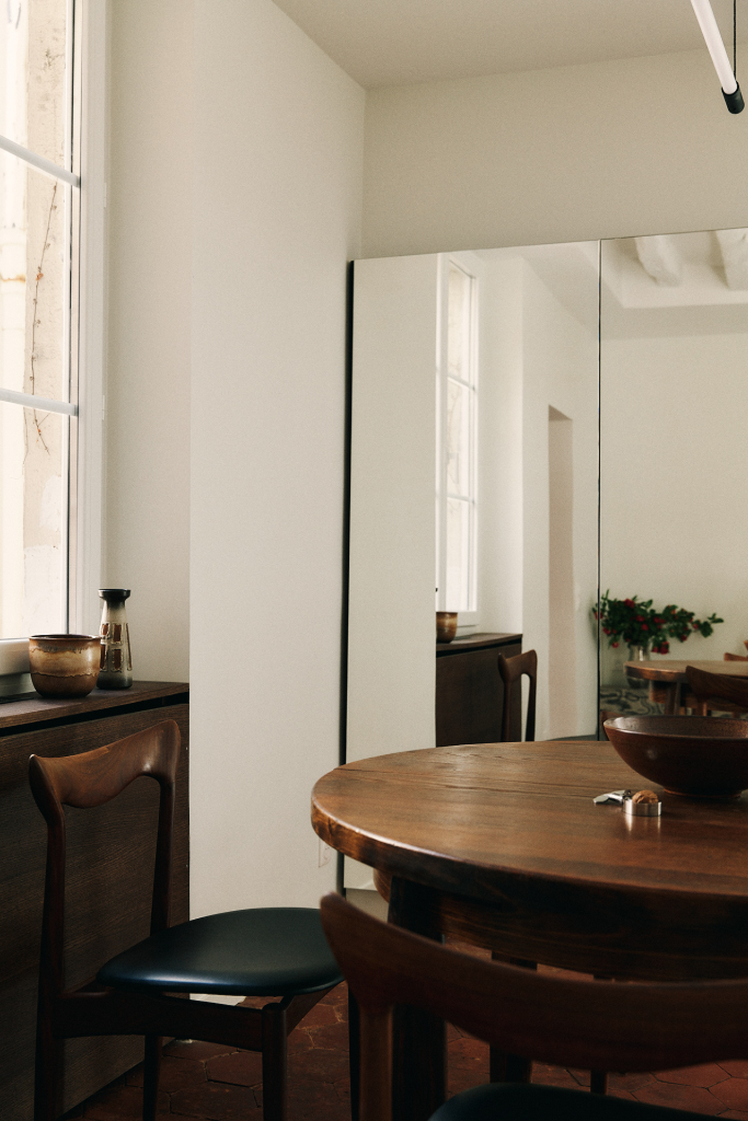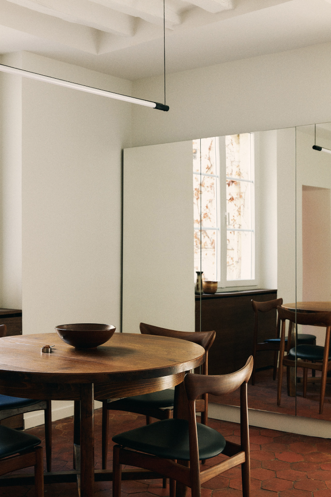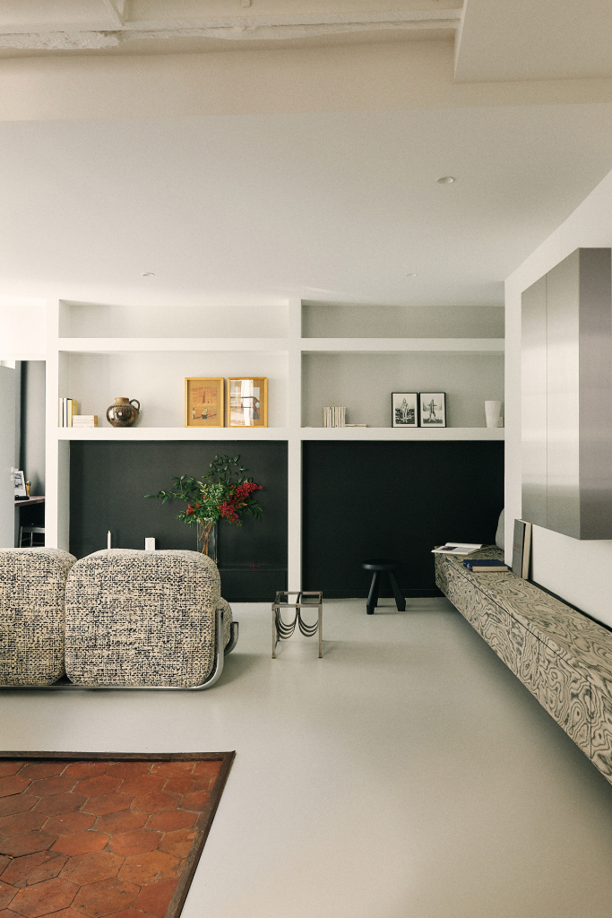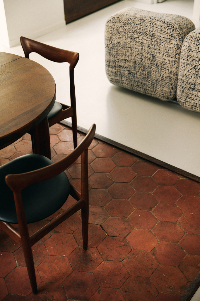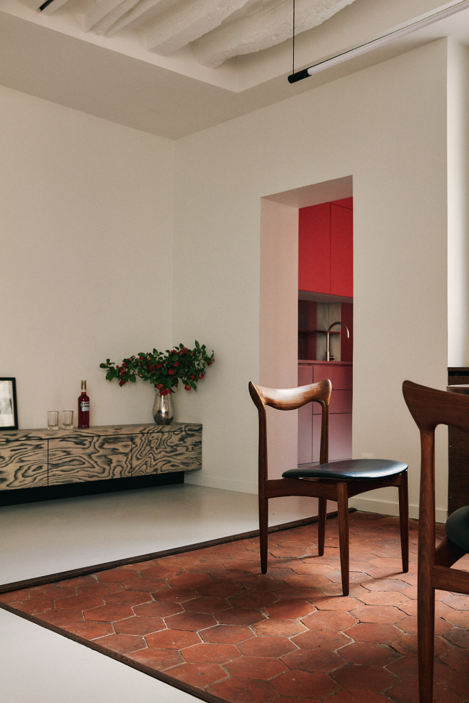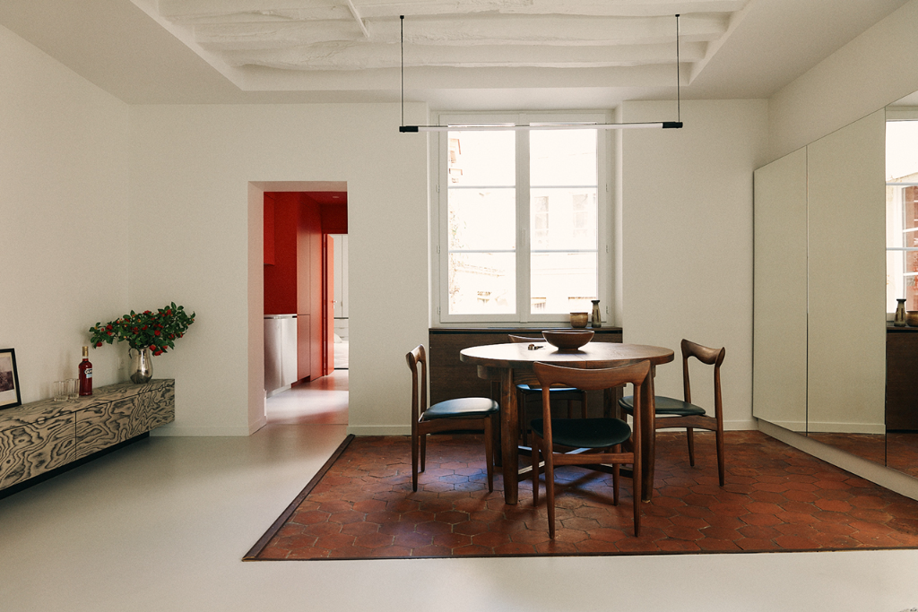 材質選擇強調延展性,地坪採用統一材質,使各個區域相互連結,天花板則保留原始木梁結構,藉此增添一份歷史感。紅陶磚與舊木梁的結合,讓這座公寓不僅擁有當代設計的俐落線條,也保留巴黎這座城市獨有的歲月痕跡,深刻演繹歷史與現代並存的魅力。