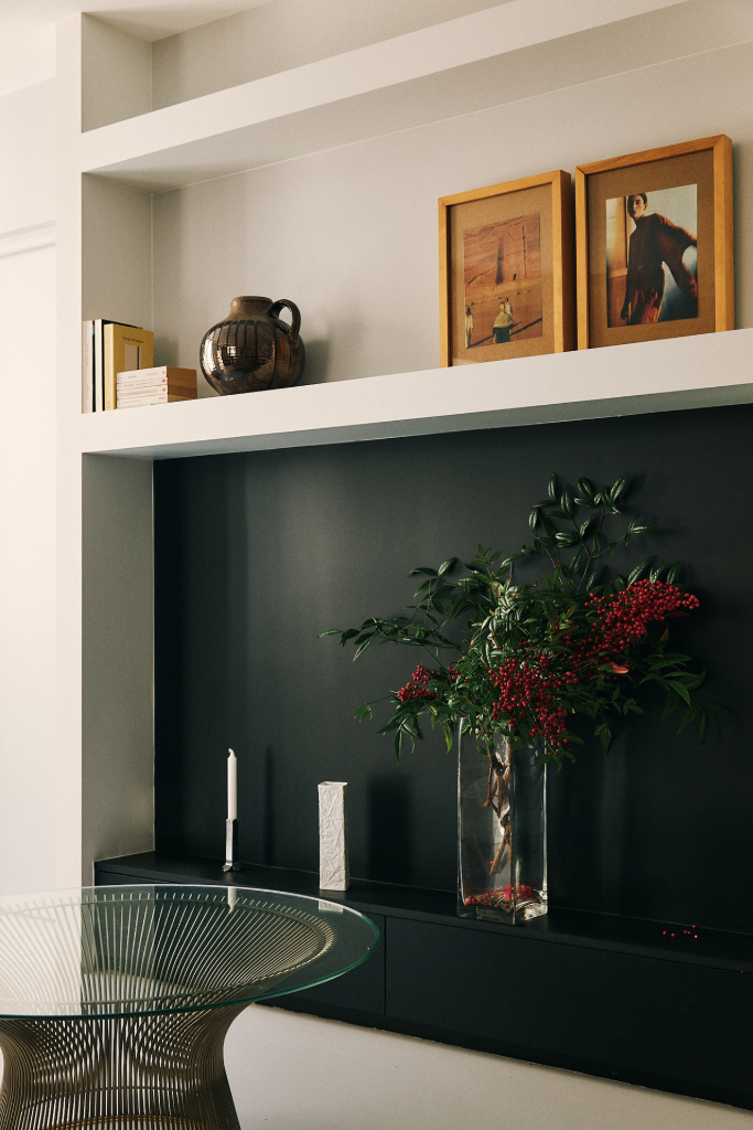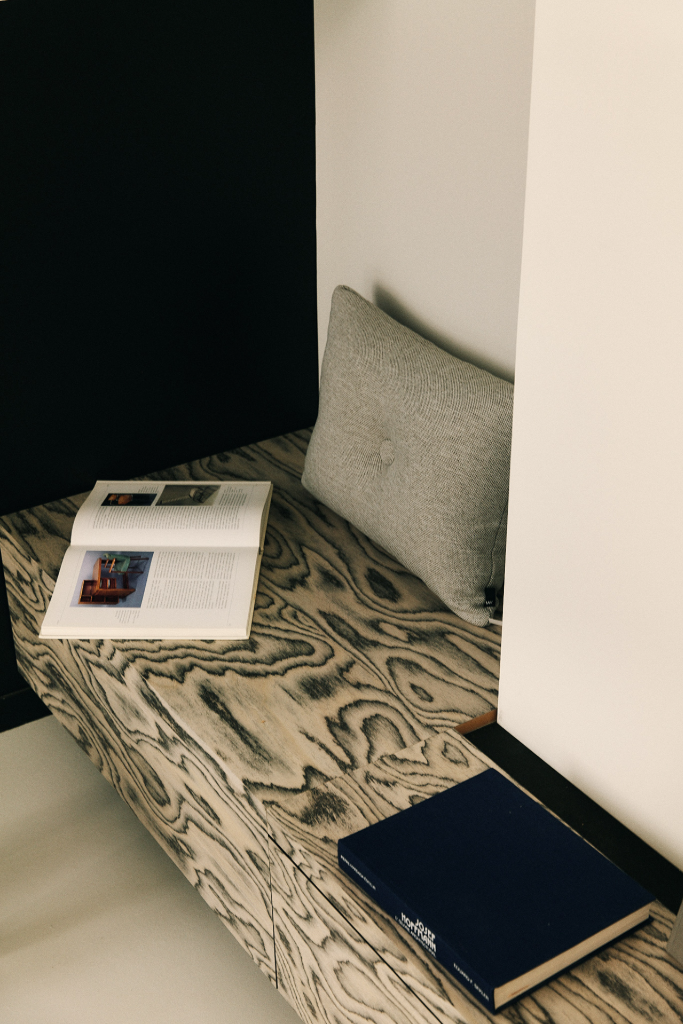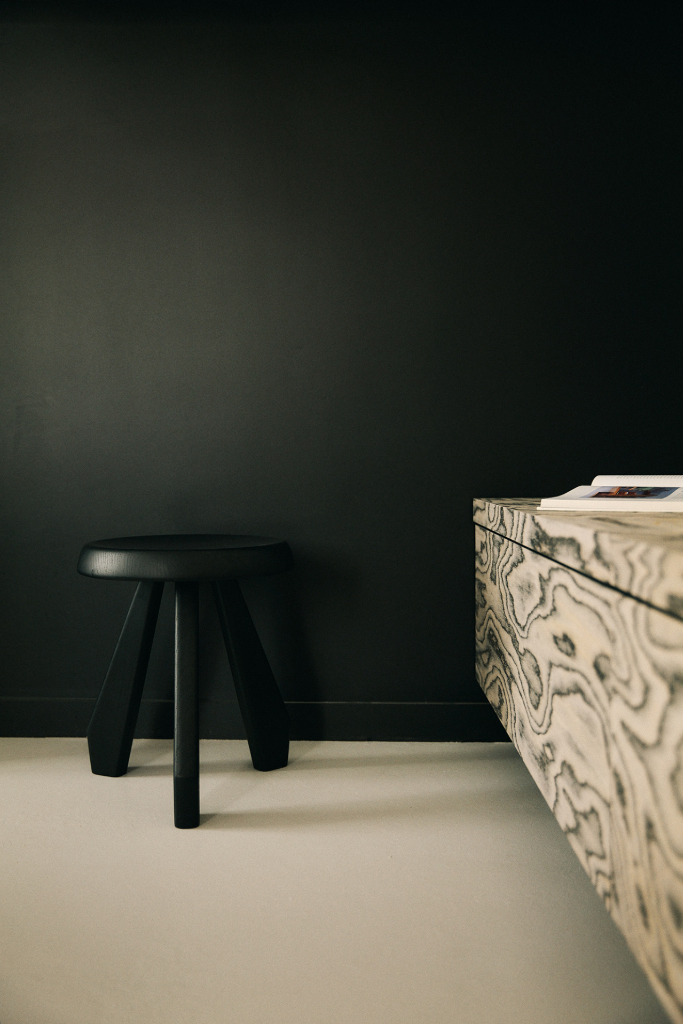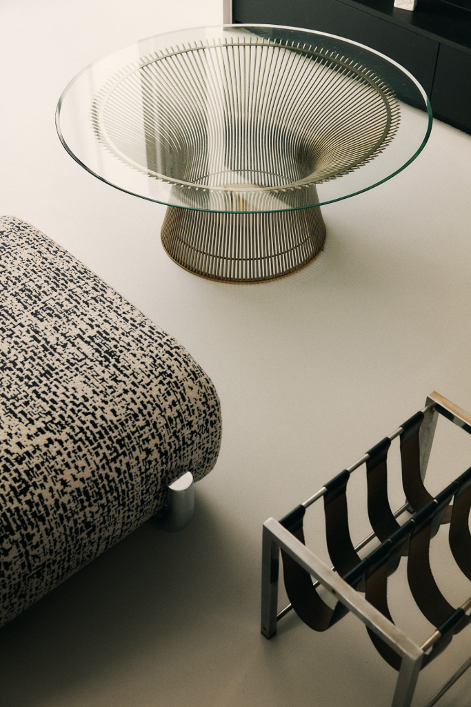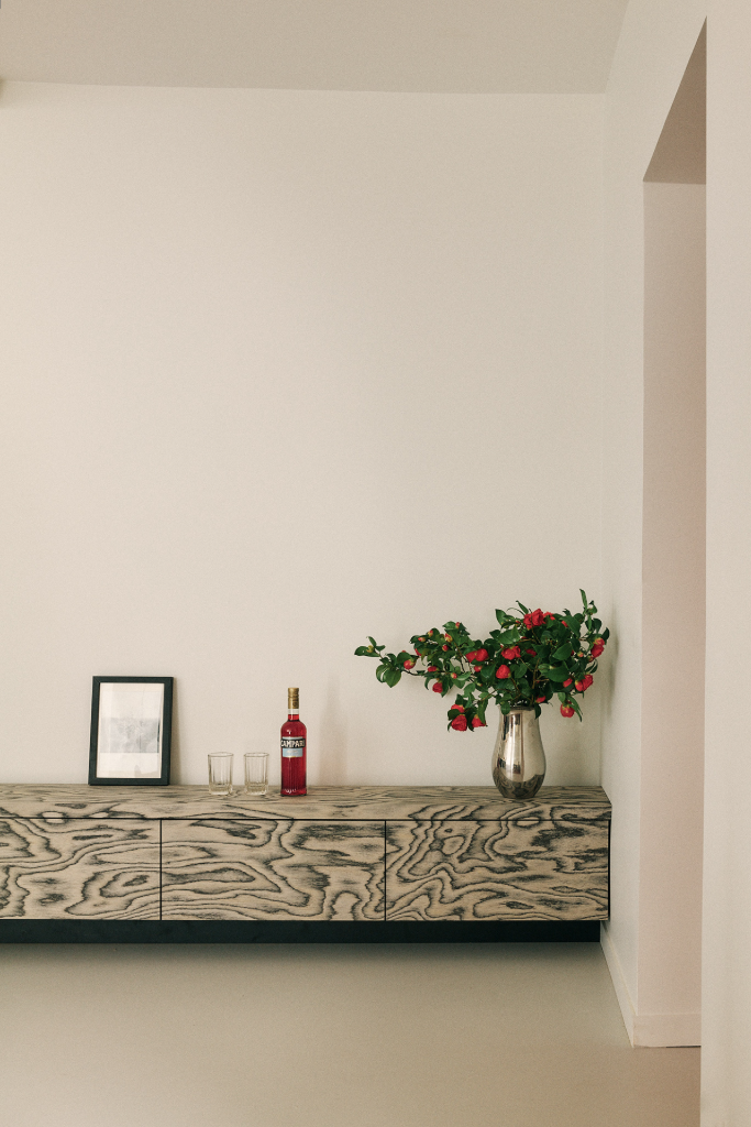 客廳設計體現了極簡與層次的完美平衡,懸浮式邊櫃與低矮的Alpi-wood(Ettore Sottsass)家具,突顯一種不著痕跡的現代感。整體色調以黑、白、灰為主,搭配深色橡木窗台,使空間既冷靜又帶有溫度。而懸浮式邊櫃上的紋理,猶如自然木紋流動般的藝術,細節處更透出難得的手工質感,讓人忍不住細細品味。