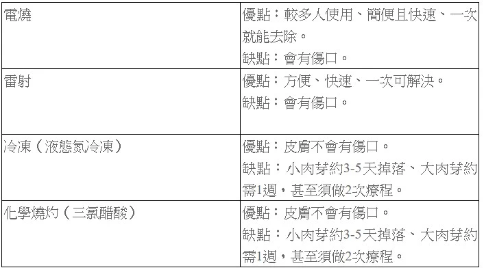 小肉芽雖不會有健康上的疑慮,不過,如果長在臉上,便不是愛美人士所樂見。俞佑說,小肉芽長出來之後,不會自行消失,因此,如果愛美女性真的想去除肉芽,可以找專業皮膚科醫師,利用電燒、雷射或冷凍、化學燒灼等方式來去除。