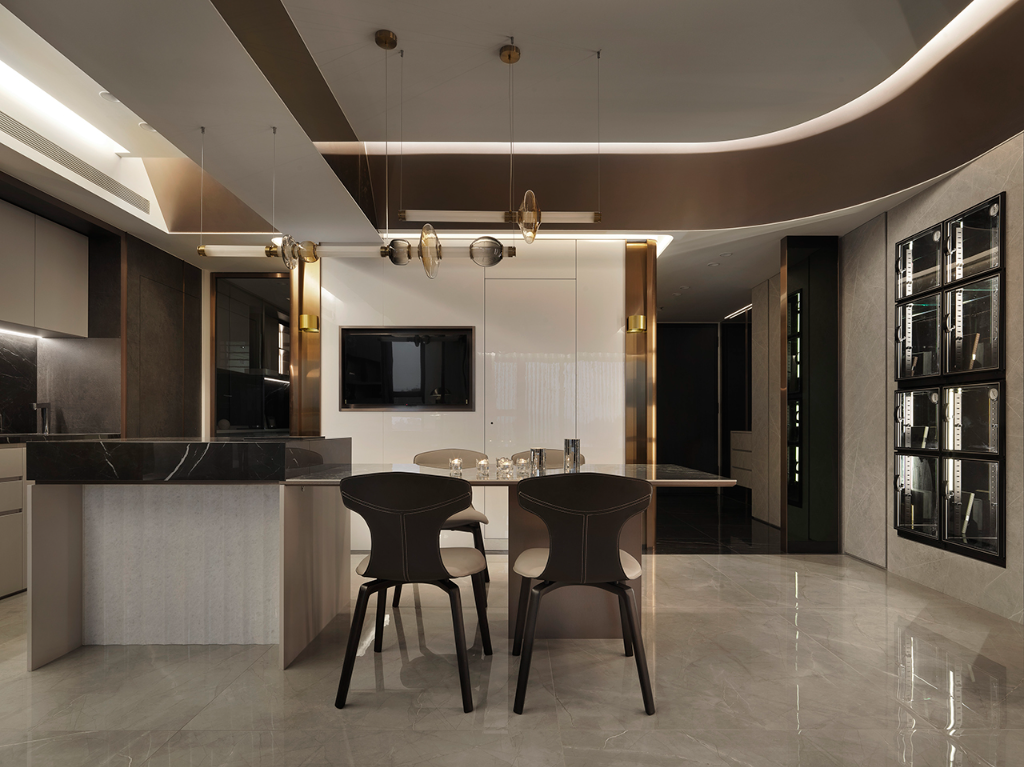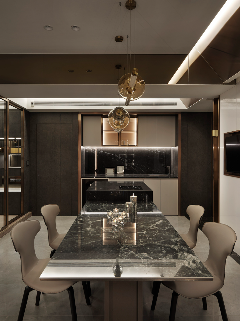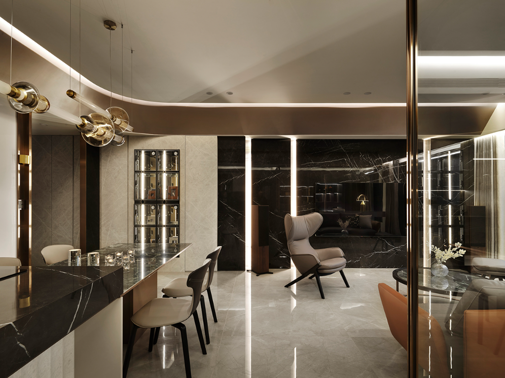 客廳電視牆是一場關於質感的精密計算,慕澤設計特意選用深色大理石為基底,透過精準的切割與嵌燈設計,使冷峻的石材表面呈現多變的肌理變化,低語著歲月流轉的痕跡。近似的語彙同樣延伸至一旁吧台區域,黑色石材點綴著金屬飾件,營造出克制而優雅的奢華感,彷彿一場低聲吟詠的交響樂,叫人打從心底感到震撼。