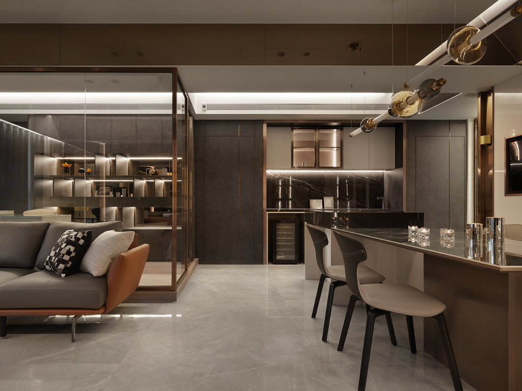 客廳沙發後方與多功能室之間藉由大面積透明玻璃分隔,卻不切割視覺的完整性,使空間得以延續並產生層次變化。玻璃的通透特性讓光線於室內自在穿梭,替整體氛圍增添不羈調性,同時也模糊了彼此的界線,讓屋主一家人能夠在閱讀、休憩與社交之間隨意轉換。牆面展示櫃與吧台則作為場域串聯的樞紐,運用環環相扣的美感連結與發揮到極致的建材之美,深刻彰顯無與倫比的居所工藝。