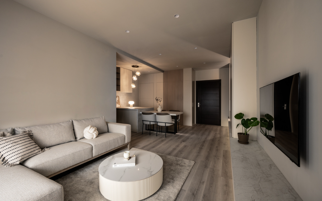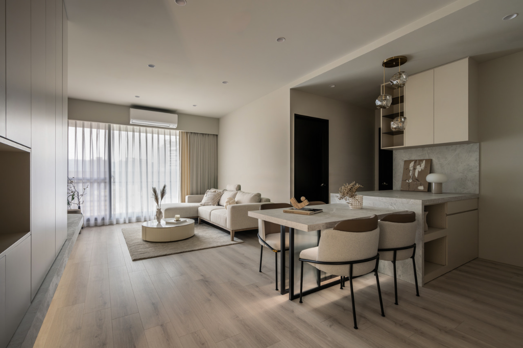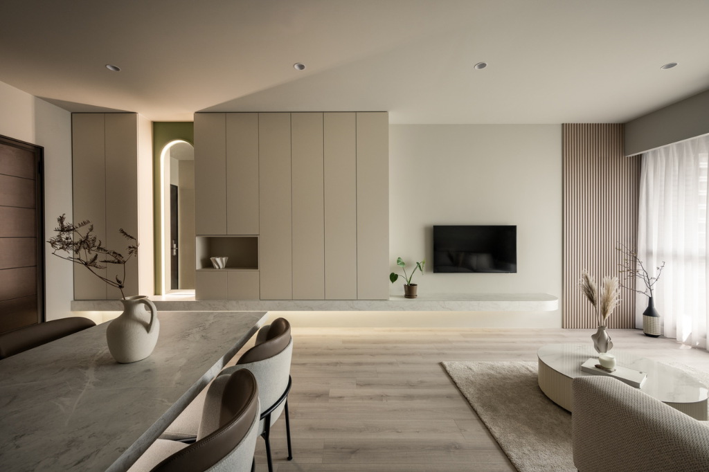 接著便直接進入開放式的客餐廳。挑高達295公分的天花板,搭配無阻隔的格局規劃,讓室內顯得格外寬敞。地面鋪設溫潤的木地板,為空間增添自然氣息。客廳保持極簡風格,電視牆僅做簡單油漆處理,顯得乾淨俐落。電視下方平台採用木作結構包覆石紋透心美耐板,無黑色接縫的精細處理使其媲美真實石材,且平台下方的間接燈光為夜晚時分營造浪漫氛圍。
