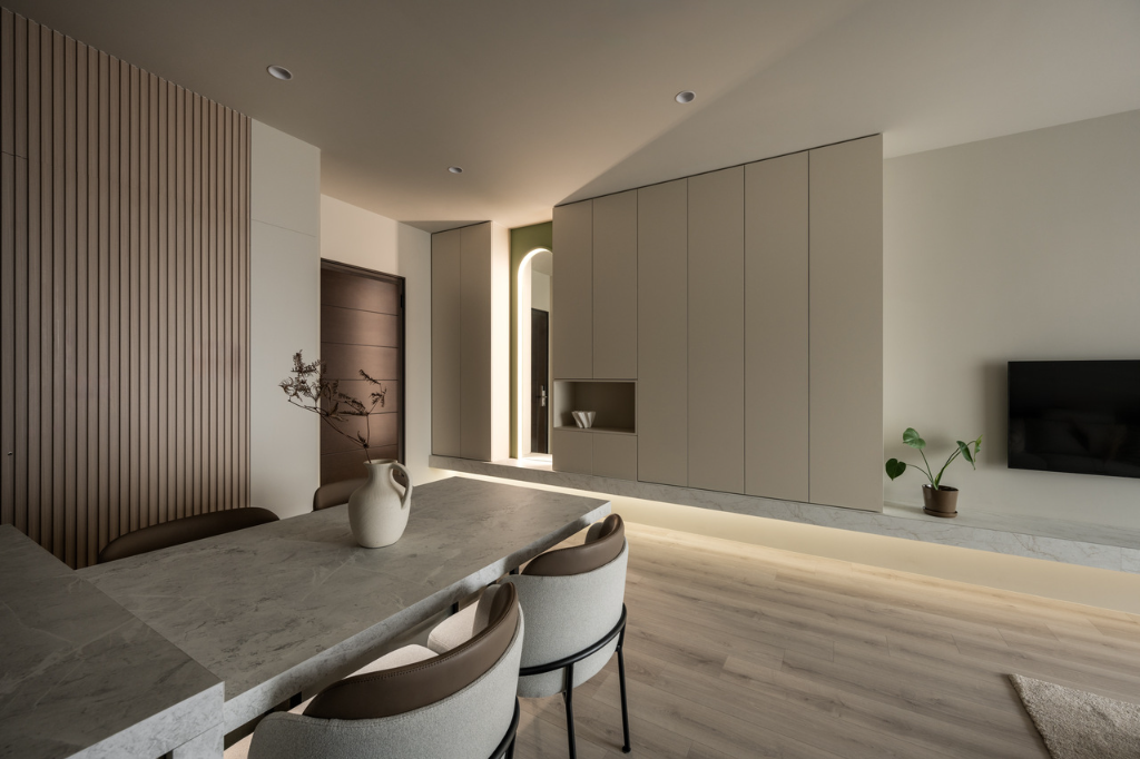 靠近落地窗處的格柵牆面巧妙修飾掉窗簾盒,讓陽光透過格柵灑落形成律動光影。餐廳區域的餐桌選用鐵件鑲嵌玻璃作為桌腳,大幅強化穿透感。沈宏杰總監並特意將燈條隱藏於餐桌桌腳鋁料之間,使光線自下而上透出,創造輕盈浮動的視覺效果。與餐桌相連的中島吧台兼具電器櫃功能,平台上方作為餐櫃使用,側向則放置電器,實用性與美觀性兼備。