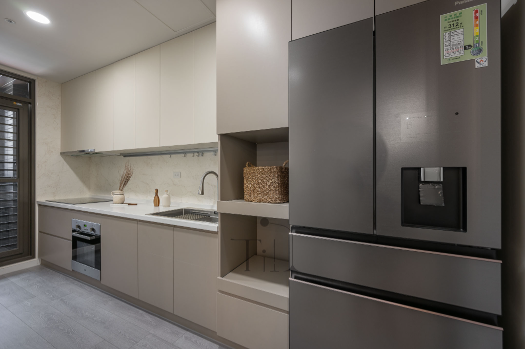 此外,通往廚房與客衛的門採用隱藏式設計,藉以保持視線的乾淨利落,在不使用時與牆面渾然一體,讓空間線條更加流暢。照明方面,整體公領域以嵌燈為主,只有中島天花吊掛一盞主燈,簡約語彙反倒突顯公領域的立體層次。