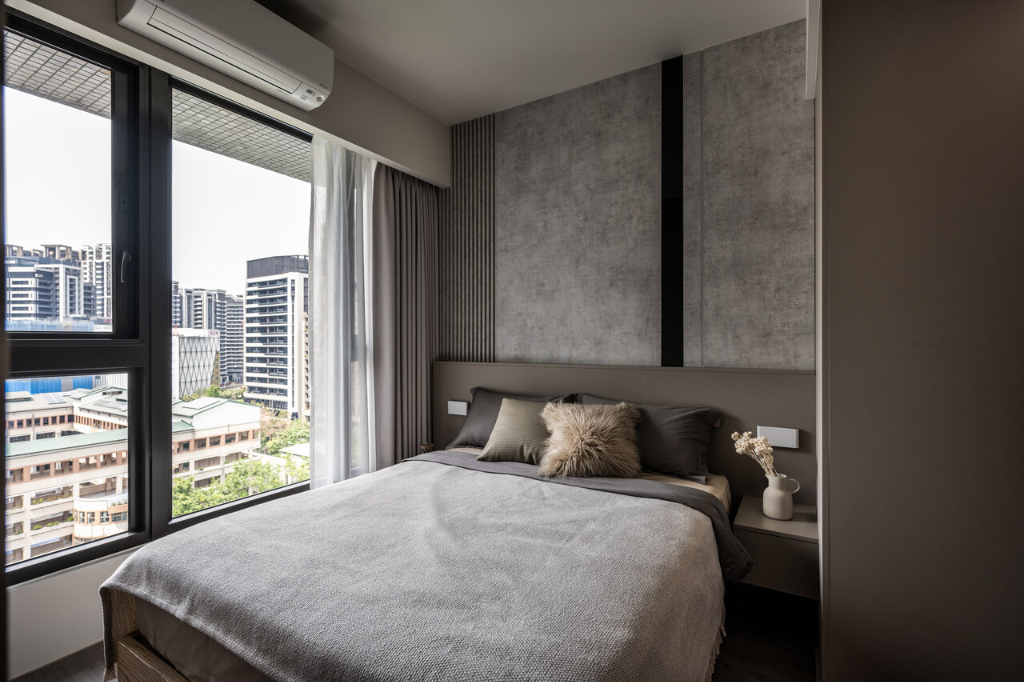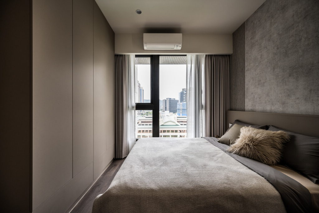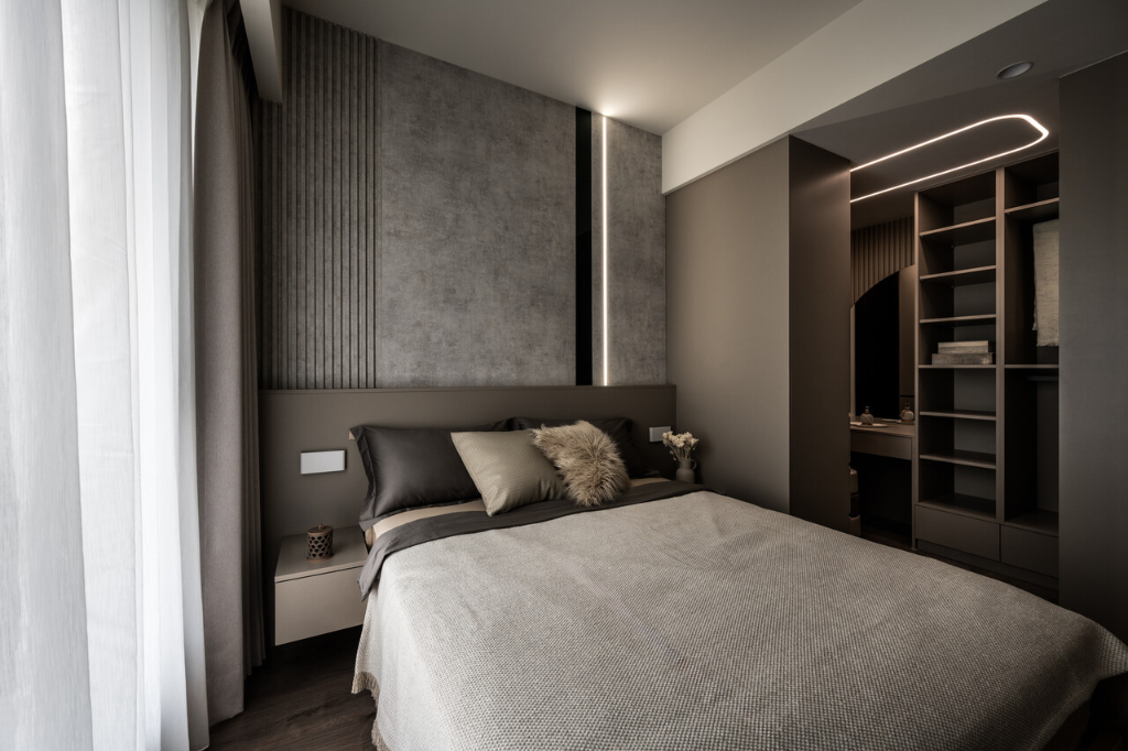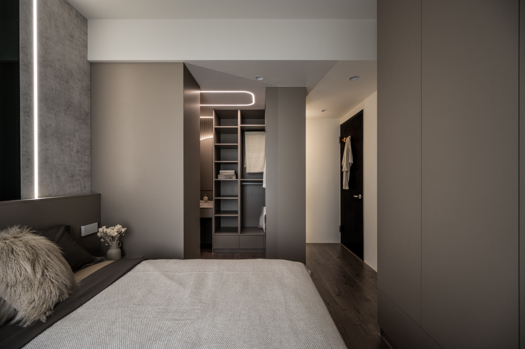 來到主臥室,能夠發現設計風格明顯轉變,沈宏杰總監採用可可色系作為主色調,比公領域來得更加沉穩內斂,既有助於睡眠品質,也形成公私領域的明確區隔,強化屋主的個性特質。床頭背牆使用安藤清水模系統板,不規則紋理形塑豐富質感,搭配黑鏡、燈條與格柵造型,細節分明且成熟大氣。